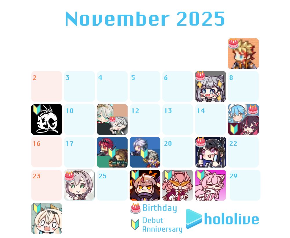 https://www.youtube.com/watch?v=KBDNxArtbOE Sora-Riona cover premierehttps://www.youtube.com/watch?v=4dgcHJW1p30 Lui orisong feat. Laplus MV premierehttps://www.youtube.com/watch?v=x1ozv_lQtow Fubuki Kirby Air Ridershttps://www.youtube.com/watch?v=--5JCd6Dc8Q Okayu Marshmallow+announcehttps://www.youtube.com/watch?v=xsH3ZjeC5Ak Ririka Inazuma Eleven: Victory Road