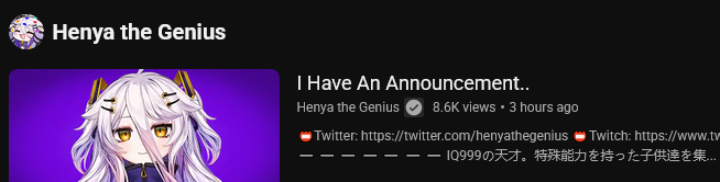 I discovered nyara from twitter and I absolutely adore her, I love her voice (I know it's clocky I don't care) and I love all the clips of her baiting femboy-lovers playing valoranttoday was a good dayI've also just been watching a lot of other indie vtubers from twitter clips which has been fun, I used to only watch hololive just because I didn't know how to find good clips but there's a lot of funny ones