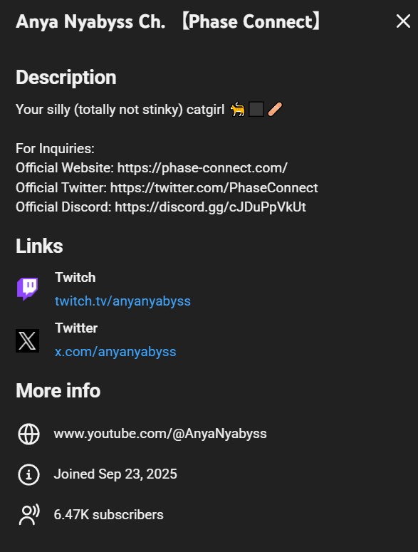 ▼ Phase Connect LinksOfficial Website: https://phase-connect.comOfficial Schedule: https://schedule.phase-connect.comOfficial Twitter: https://x.com/PhaseConnect | https://x.com/PhaseConnectJPOfficial Character References: https://rentry.org/pcgreferencesOfficial Twitch Archive Channels: https://rentry.org/pcgtwitcharchiveUnofficial Phase Connect Archives: https://rentry.org/pcgunofficialarchive––––––––––––––––––––––––––––––––––◆【Lia】https://x.com/rinkouashelia | https://youtube.com/RinkouAshelia | https://twitch.tv/asheliarinkou◆【Utatane Nasa】転寝ナサ (JP) https://x.com/UtataneNasa | https://youtube.com/UtataneNasa | https://twitch.tv/utatanenasa◆【Hakushika Iori】白鹿いおり (JP + EN) https://x.com/hakushikaiori | https://youtube.com/HakushikaIori | https://twitch.tv/iorihakushika◆【Fujikura Uruka】https://x.com/fujikurauruka | https://youtube.com/FujikuraUruka | https://twitch.tv/fujikurauruka◆【Shisui Michiru】紫翠みちる (JP) https://x.com/shisuimichiru | https://youtube.com/ShisuiMichiru | https://twitch.tv/michiru_shisui◆【Tenma Maemi】https://x.com/tenmamaemi | https://youtube.com/TenmaMaemi | https://twitch.tv/tenma◆【Pipkin Pippa】https://x.com/pipkinpippa | https://youtube.com/PipkinPippa | https://twitch.tv/pippa––––––––––––––––––––––––––––––––––◆【Kaneko Lumi】https://x.com/kaneko_lumi | https://youtube.com/KanekoLumi | https://twitch.tv/kanekolumi◆【Dizzy Dokuro】https://x.com/dizzydokuro | https://youtube.com/@dizzydokuro | https://twitch.tv/dizzydokuro◆【Jelly Hoshiumi】https://x.com/jellyhoshiumi | https://youtube.com/@jellyhoshiumi | https://twitch.tv/jellyhoshiumi◆【Ember Amane】https://x.com/emberamane | https://youtube.com/@EmberAmane | https://twitch.tv/emberamane◆【Clio Aite】https://x.com/ClioAite | https://youtube.com/@ClioAite | https://twitch.tv/clioaite◆【MariMari_en】https://x.com/MARIMARI_EN | https://youtube.com/@MARIMARI_EN | https://twitch.tv/marimari_en◆【Eepy Sleepy】https://x.com/EepySleepyCh | https://youtube.com/@EepySleepyCh | https://twitch.tv/EepySleepy––––––––––––––––––––––––––––––––––◆【Remilia Nephys】https://x.com/Remilia_Nephys | https://youtube.com/RemiliaNephys | https://twitch.tv/remilianephys◆【Chisaka Airi】https://x.com/ChisakaAiri | https://youtube.com/ChisakaAiri | https://twitch.tv/chisakaairi◆【Amanogawa Shiina】https://x.com/AmanogawaShiina | https://youtube.com/AmanogawaShiina | https://twitch.tv/amanogawashiina◆【Himemiya Rie】https://x.com/HimemiyaRie | https://youtube.com/HimemiyaRie | https://twitch.tv/himemiyarie◆【Erina Makina】https://x.com/ErinaMakina | https://youtube.com/ErinaMakina | https://twitch.tv/erinamakina◆【Komachi Panko】https://x.com/komachipanko | https://youtube.com/KomachiPanko | https://twitch.tv/komachipanko––––––––––––––––––––––––––––––––––◆【Runie Ruse】https://x.com/RunieRuse | https://youtube.com/@RunieRuse | https://twitch.tv/RunieRuse◆【Eimi Isami】https://x.com/eimiisami | https://youtube.com/@eimiisami | https://twitch.tv/eimiisami◆【Muu Muyu】https://x.com/Muu_Muyu | https://youtube.com/@MuuMuyu | https://twitch.tv/MuuMuyu◆【Hikanari Hina】https://x.com/HikanariHina | https://youtube.com/@HikanariHina | https://twitch.tv/HikanariHina◆【Saya Sairroxs】[Hort] https://x.com/sayasairroxs | https://youtube.com/@sayasairroxs | https://twitch.tv/sayasairroxs––––––––––––––––––––––––––––––––––◆【Kannagi Loki】巫ロキ (JP) https://x.com/kannagiloki | https://youtube.com/@kannagiloki◆【Kokoromo Memory】恋衣めもり (JP) https://x.com/kokoromomemory | https://youtube.com/@kokoromomemory_ | https://twitch.tv/kokoromomemory◆【Gram Pico】倉夢ぴこ (JP) https://x.com/grampico_ | https://youtube.com/@grampico | https://twitch.tv/grampico◆【Ayase Yuu】絢世ユウ (JP) https://x.com/ayaseyuuu | https://youtube.com/@ayaseyuu | https://twitch.tv/ayaseyuu_◆【Kaminari Clara】歌美鳴クララ (EN + JP) https://x.com/kaminariclara_ | https://youtube.com/@kaminariclara | https://twitch.tv/kaminariclara––––––––––––––––––––––––––––––––––◆【Malice Evermore】https://x.com/MaliceEvermore | https://youtube.com/@maliceevermore | https://twitch.tv/maliceevermore◆【Nitya Nil】https://x.com/Nitya_Nil | https://youtube.com/@Nitya_Nil | https://twitch.tv/nitya_nil◆【Wilhelmina Frost】https://x.com/wilhelminafr0st | https://youtube.com/@wilhelminafrost | https://twitch.tv/wilhelminafrost◆【Bibi Biscuit】https://x.com/BibiBiscuitCh | https://youtube.com/@bibibiscuitch | https://twitch.tv/bibibiscuitch◆【Anya Nyabyss】https://x.com/AnyaNyabyss | https://youtube.com/@AnyaNyabyss | https://twitch.tv/anyanyabyss◆【Sinon Sinfonia】https://x.com/SinonSinfonia | https://youtube.com/@SinonSinfonia | https://twitch.tv/sinonsinfoniaPrevious Thread:>>107038282