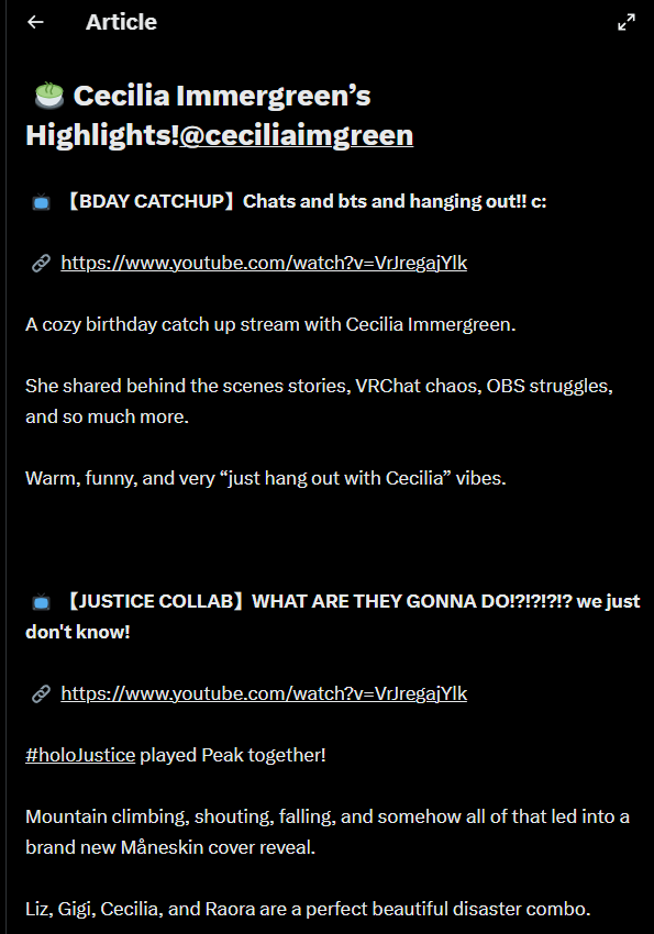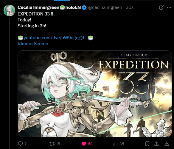 The 650th Wind>NEXT STREAM: 【EXPEDITION 33】FRENCH AUTOMATON PLAYS FRENCH GAMEhttps://www.youtube.com/watch?v=pW9uge_Qfp0>LAST STREAM: 【STREAM】el streamhttps://www.youtube.com/watch?v=kijBbpEcthQ>Links:YouTube: https://www.youtube.com/@holoen_ceciliaimmergreenTwitter: https://twitter.com/ceciliaimgreenImportant Videos: https://rentry.org/ImmerMarks>Music:https://rentry.org/ImmerPiece【Hololive EN Justice】ABOVE BELOW- https://www.youtube.com/watch?v=ilLEj-SCCn8【Cover】 Forgotten Words | 忘れじの言の葉 #歌ってみた - https://www.youtube.com/watch?v=twto2g0FwTQ【Hololive EN】Odyssey - https://www.youtube.com/watch?v=0wO8d70KSXw【ENReco Orisong】Oh Princess - https://www.youtube.com/watch?v=5x9ix5CGmoo【CCGG Cover】Naimononedari / ないものねだり - https://www.youtube.com/watch?v=Qq-fgjrc-uc【CCGG Cover】Turing Love / チューリングラブ - https://www.youtube.com/watch?v=hX_3P0TBGP4【Hololive EN】 All for One - https://www.youtube.com/watch?v=ok24HgzbeLs【Hololive EN Justice】RENEGADE - https://www.youtube.com/watch?v=xg6DUmRRXlw【Cover】nevermore / ネヴァモア -https://www.youtube.com/watch?v=FZkkGB2bUyo【Original Song】Wind-Up - https://youtube.com/watch?v=Kqh6-vjars8>Merch:https://rentry.org/ImmerMerchHoloPro: https://shop.hololivepro.com/en/collections/ceciliaimmergreenGeekJack: https://shop.geekjack.net/pages/hololive>Tags:#ImmerScreen (Stream) https://twitter.com/hashtag/ImmerScreen#Immergination (Art) https://twitter.com/hashtag/Immergination#ImmerPiece (Music) https://twitter.com/hashtag/ImmerMusic#ImmerMemes (Memes) https://twitter.com/hashtag/ImmerMemes>/grün/ OP Template:https://rentry.org/ImmerTemplate>Previous Thread: >>107052335