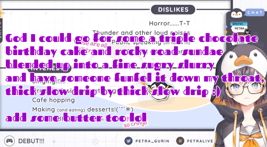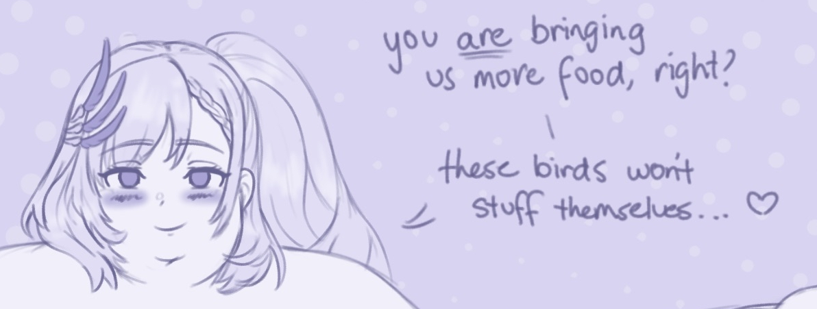 Consider Blueberry Chuubas and also Thanksgiving.>>107108463I think that title would be handed to Duwag or Ember but Reine is a strong contender with how often she snacks or has a meal on stream.