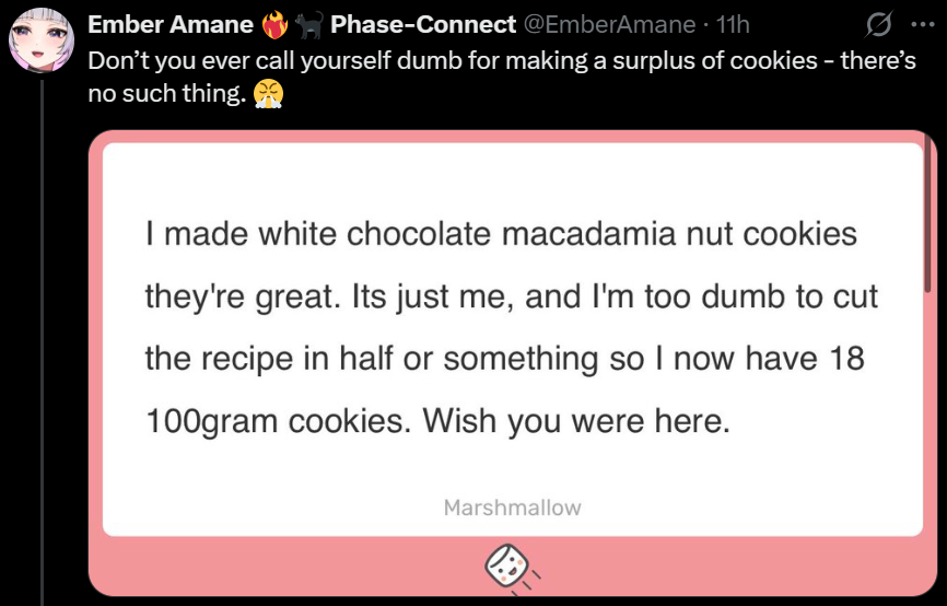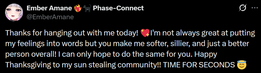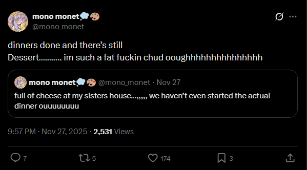 >>107112382you never know, the holiday feasting season could destruct her gym arc, think about her tummy full of good foodhttps://x.com/EmberAmane/status/1994192680272716020