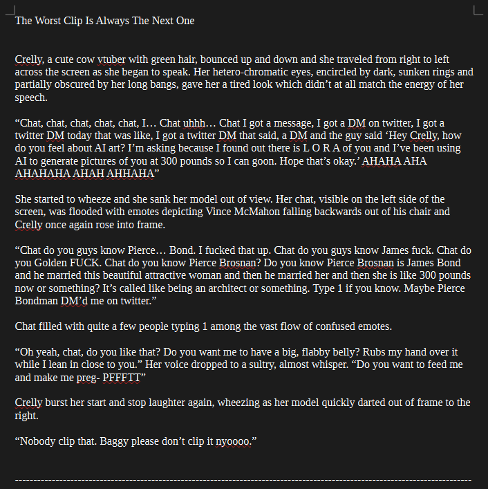 >>107144661Hopefully you will accept written Crelly in the meantime. I'm struggling a bit with trying to format the story since I've never tried to write a fic where the vtuber is actually a vtuber in the story but once I figure how to structure this properly it shouldn't take terribly long.
