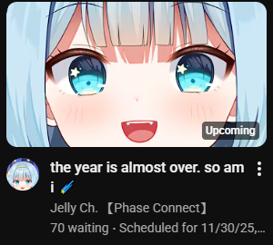 ▼ Phase Connect LinksOfficial Website: https://phase-connect.comOfficial Schedule: https://schedule.phase-connect.comOfficial Twitter: https://x.com/PhaseConnect | https://x.com/PhaseConnectJPOfficial Character References: https://rentry.org/pcgreferencesOfficial Twitch Archive Channels: https://rentry.org/pcgtwitcharchiveUnofficial Phase Connect Archives: https://rentry.org/pcgunofficialarchive––––––––––––––––––––––––––––––––––◆【Lia】https://x.com/rinkouashelia | https://youtube.com/RinkouAshelia | https://twitch.tv/asheliarinkou◆【Utatane Nasa】転寝ナサ (JP) https://x.com/UtataneNasa | https://youtube.com/UtataneNasa | https://twitch.tv/utatanenasa◆【Hakushika Iori】白鹿いおり (JP + EN) https://x.com/hakushikaiori | https://youtube.com/HakushikaIori | https://twitch.tv/iorihakushika◆【Fujikura Uruka】https://x.com/fujikurauruka | https://youtube.com/FujikuraUruka | https://twitch.tv/fujikurauruka◆【Shisui Michiru】紫翠みちる (JP) https://x.com/shisuimichiru | https://youtube.com/ShisuiMichiru | https://twitch.tv/michiru_shisui◆【Tenma Maemi】https://x.com/tenmamaemi | https://youtube.com/TenmaMaemi | https://twitch.tv/tenma◆【Pipkin Pippa】https://x.com/pipkinpippa | https://youtube.com/PipkinPippa | https://twitch.tv/pippa––––––––––––––––––––––––––––––––––◆【Kaneko Lumi】https://x.com/kaneko_lumi | https://youtube.com/KanekoLumi | https://twitch.tv/kanekolumi◆【Fuura Yuri】[Terminated] https://x.com/AmarisYuri | Archive: https://youtube.com/@TheNationalFuuraYuriArchive◆【Dizzy Dokuro】https://x.com/dizzydokuro | https://youtube.com/@dizzydokuro | https://twitch.tv/dizzydokuro◆【Jelly Hoshiumi】https://x.com/jellyhoshiumi | https://youtube.com/@jellyhoshiumi | https://twitch.tv/jellyhoshiumi◆【Ember Amane】https://x.com/emberamane | https://youtube.com/@EmberAmane | https://twitch.tv/emberamane◆【Clio Aite】https://x.com/ClioAite | https://youtube.com/@ClioAite | https://twitch.tv/clioaite◆【MariMari_en】https://x.com/MARIMARI_EN | https://youtube.com/@MARIMARI_EN | https://twitch.tv/marimari_en◆【Eepy Sleepy】https://x.com/EepySleepyCh | https://youtube.com/@EepySleepyCh | https://twitch.tv/EepySleepy––––––––––––––––––––––––––––––––––◆【Remilia Nephys】https://x.com/Remilia_Nephys | https://youtube.com/RemiliaNephys | https://twitch.tv/remilianephys◆【Chisaka Airi】https://x.com/ChisakaAiri | https://youtube.com/ChisakaAiri | https://twitch.tv/chisakaairi◆【Amanogawa Shiina】https://x.com/AmanogawaShiina | https://youtube.com/AmanogawaShiina | https://twitch.tv/amanogawashiina◆【Himemiya Rie】https://x.com/HimemiyaRie | https://youtube.com/HimemiyaRie | https://twitch.tv/himemiyarie◆【Erina Makina】https://x.com/ErinaMakina | https://youtube.com/ErinaMakina | https://twitch.tv/erinamakina◆【Komachi Panko】https://x.com/komachipanko | https://youtube.com/KomachiPanko | https://twitch.tv/komachipanko––––––––––––––––––––––––––––––––––◆【Runie Ruse】https://x.com/RunieRuse | https://youtube.com/@RunieRuse | https://twitch.tv/RunieRuse◆【Eimi Isami】https://x.com/eimiisami | https://youtube.com/@eimiisami | https://twitch.tv/eimiisami◆【Muu Muyu】https://x.com/Muu_Muyu | https://youtube.com/@MuuMuyu | https://twitch.tv/MuuMuyu◆【Hikanari Hina】https://x.com/HikanariHina | https://youtube.com/@HikanariHina | https://twitch.tv/HikanariHina◆【Saya Sairroxs】[Hort] https://x.com/sayasairroxs | https://youtube.com/@sayasairroxs | https://twitch.tv/sayasairroxs––––––––––––––––––––––––––––––––––◆【Kannagi Loki】巫ロキ (JP) https://x.com/kannagiloki | https://youtube.com/@kannagiloki ◆【Kokoromo Memory】恋衣めもり (JP) https://x.com/kokoromomemory | https://youtube.com/@kokoromomemory_ | https://twitch.tv/kokoromomemory◆【Gram Pico】倉夢ぴこ (JP) https://x.com/grampico_ | https://youtube.com/@grampico | https://twitch.tv/grampico◆【Ayase Yuu】絢世ユウ (JP) https://x.com/ayaseyuuu | https://youtube.com/@ayaseyuu | https://twitch.tv/ayaseyuu_◆【Kaminari Clara】歌美鳴クララ (EN + JP) https://x.com/kaminariclara_ | https://youtube.com/@kaminariclara | https://twitch.tv/kaminariclara––––––––––––––––––––––––––––––––––◆【Malice Evermore】https://x.com/MaliceEvermore | https://youtube.com/@maliceevermore | https://twitch.tv/maliceevermore◆【Nitya Nil】https://x.com/Nitya_Nil | https://youtube.com/@Nitya_Nil | https://twitch.tv/nitya_nil◆【Wilhelmina Frost】https://x.com/wilhelminafr0st | https://youtube.com/@wilhelminafrost | https://twitch.tv/wilhelminafrost◆【Bibi Biscuit】https://x.com/BibiBiscuitCh | https://youtube.com/@bibibiscuitch | https://twitch.tv/bibibiscuitch◆【Anya Nyabyss】https://x.com/AnyaNyabyss | https://youtube.com/@AnyaNyabyss | https://twitch.tv/anyanyabyss◆【Sinon Sinfonia】https://x.com/SinonSinfonia | https://youtube.com/@SinonSinfonia | https://twitch.tv/sinonsinfoniaPrevious Thread: >>107197184