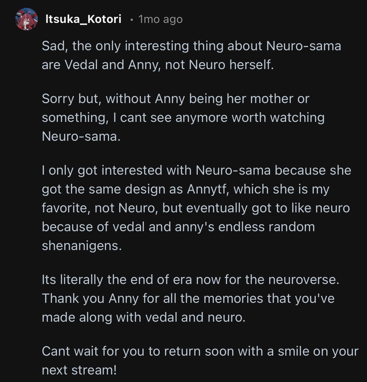 >it turns out this Neuro's purpose never wavered from being an AA ad. After AA sells 40k copies, Vedal shuts off Neuro and retires. The (non-existent) concert, neurodog, all of it was just an elaborate marketing stunt. The entire 5-year ordeal netted him a respectable $200k.Your reaction?