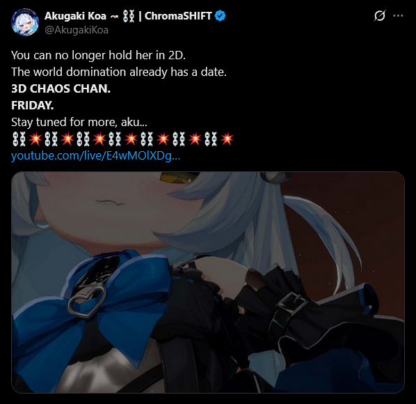【 Website 】 https://chroma-shift.com/【 YouTube 】 https://www.youtube.com/@ChromaSHIFT_BG【 Twitter 】 https://x.com/ChromaSHIFT_FTW【 Schedules 】 https://holodex.net/?org=ChromaSHIFT / https://pomu.pages.dev/jidf【 Merch 】 https://shop.bravegroup-us.com/pages/projects/chromashift=-=-=-=-=-=-=-=-=-=-=-=-=-=-=-=-=-=-=-=-=-=-=-=-=-=【 Roca Rourin 】[YouTube] https://www.youtube.com/@RourinRoca / [Twitter] https://x.com/RocaRourin / [Twitch] https://www.twitch.tv/RocaRourin【 Poko Rakun 】[YouTube] https://www.youtube.com/@RakunPoko / [Twitter] https://x.com/PokoRakun / [Twitch] https://www.twitch.tv/PokoRakun【 Mia Melonya 】[YouTube] https://www.youtube.com/@MiaMelonya / [Twitter] https://x.com/MiaMelonya / [Twitch] https://www.twitch.tv/MiaMelonya【 Koa Akugaki 】[YouTube] https://www.youtube.com/@AkugakiKoa / [Twitter] https://x.com/AkugakiKoa / [Twitch] https://www.twitch.tv/AkugakiKoa【 Ruby Runeheart 】[YouTube] https://www.youtube.com/@RubyRuneheart / [Twitter] https://x.com/RubyRuneheart / [Twitch] https://www.twitch.tv/RubyRuneheart【 Lalabell Lullaby 】[YouTube] https://www.youtube.com/@LalabellLullaby / [Twitter] https://x.com/LalabellLullaby / [Twitch] https://www.twitch.tv/LalabellLullaby【 Taiga Toragami 】[YouTube] https://www.youtube.com/@TaigaToragami / [Twitter] https://x.com/TaigaToragami / [Twitch] https://www.twitch.tv/TaigaToragami【 Enya Ignis 】[YouTube] https://www.youtube.com/@EnyaIgnis / [Twitter] https://x.com/EnyaIgnis / [Twitch] https://www.twitch.tv/EnyaIgnis【 Shabel Tonya 】[YouTube] https://www.youtube.com/@ShabelTonya / [Twitter] https://x.com/ShabelTonya / [Twitch] https://www.twitch.tv/ShabelTonya【 Chikafuji Lisa 】[YouTube] https://www.youtube.com/@ChikafujiLisa / [Twitter] https://x.com/ChikafujiLisa / [Twitch] https://www.twitch.tv/ChikafujiLisa【 Daisy Dandelion 】[YouTube] https://www.youtube.com/@DaisyDaLion / [Twitter] https://x.com/DaisyDaLion / [Twitch] https://www.twitch.tv/DaisyDaLion【 Cersea Soulstorm 】[YouTube] https://www.youtube.com/@CerseaSoulstorm / [Twitter] https://x.com/CerseaSoulstorm / [Twitch] https://www.twitch.tv/CerseaSoulstorm【 Riki Poppet 】[YouTube] https://www.youtube.com/@RikiPoppet / [Twitter] https://x.com/RikiPoppet / [Twitch] https://www.twitch.tv/RikiPoppetVT【 Yena Youngblood 】[YouTube] https://www.youtube.com/@YenaYoungblood / [Twitter] https://x.com/YenaYoungblood / [Twitch] https://www.twitch.tv/YenaYoungblood=-=-=-=-=-=-=-=-=-=-=-=-=-=-=-=-=-=-=-=-=-=-=-=-=-=【 Friends 】V&U >>>/vt//vnug/V4Mirai >>>/vt//v4m/PixelLink >>>/vt//pxl/Phase Connect >>>/vt//pcg/EIEN Extended >>>/vt//eiex/=-=-=-=-=-=-=-=-=-=-=-=-=-=-=-=-=-=-=-=-=-=-=-=-=-=Previous Thread: >>107197358