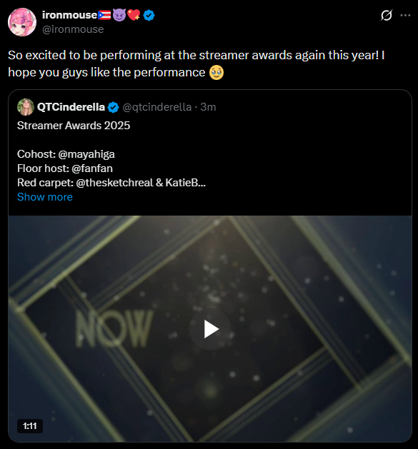 Oh, mouse is going to have a musical performance at the streamer awards again. That should be fun.