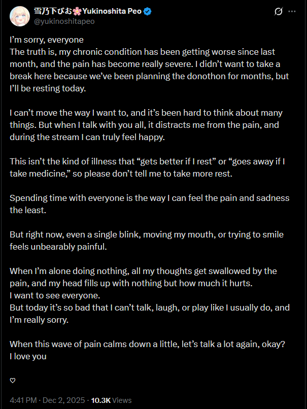 >>107273373sure, she hasn't posted anything since that tweet but I'll keep an eyeit didn't *sound* like he was in any kind of immediate critical condition recently, just juggling doctors and specialist visits to figure out what's wrong so I guess I'm hoping it's not something unexpected and bad happening