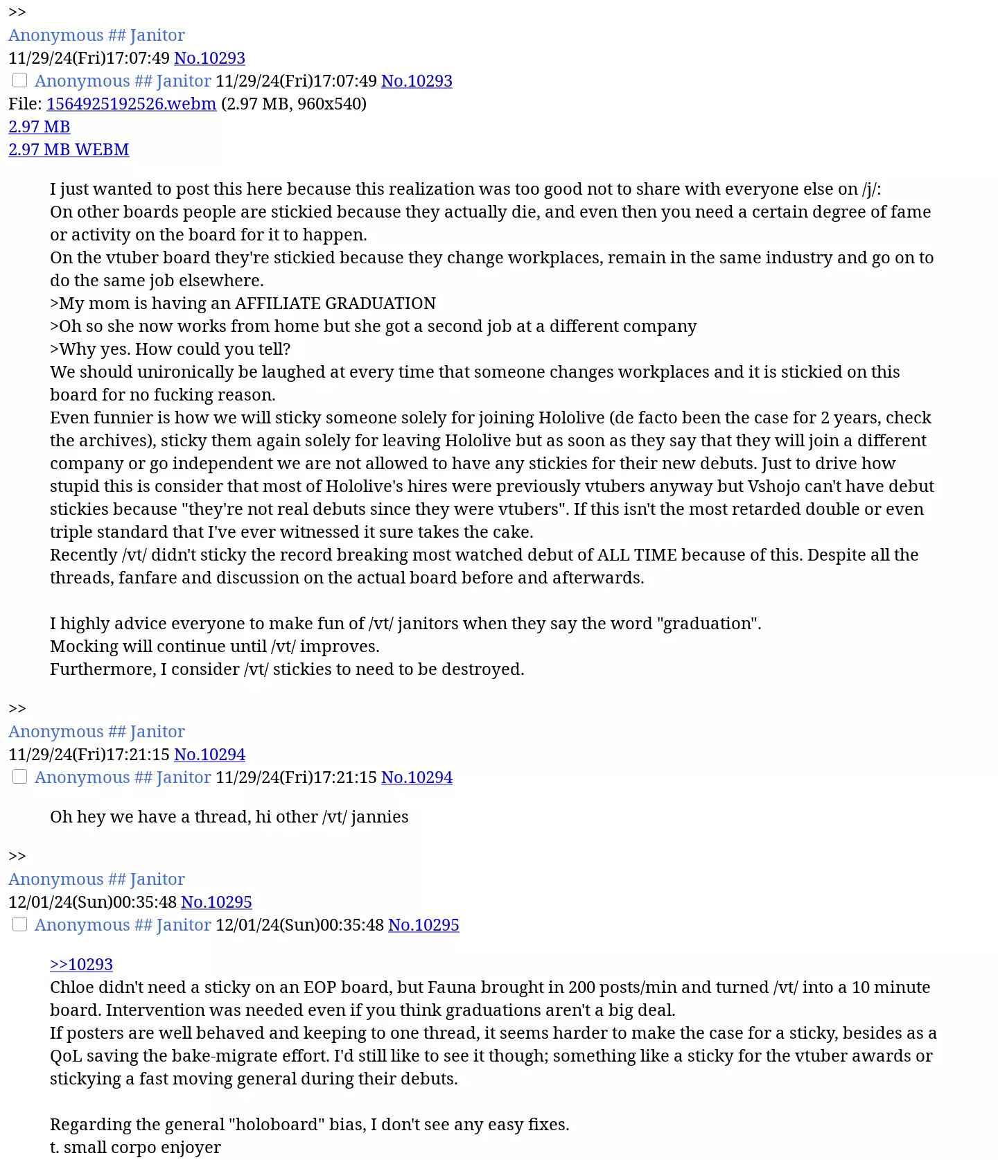 >>107249352The jap said holo has the same problem of female idol group like AKB, the popular first few gen carried hard and then when they get older and graduate, the group decline, the exp date is around 10 years for AKB, so we will she how holo fare after the 10 year mark