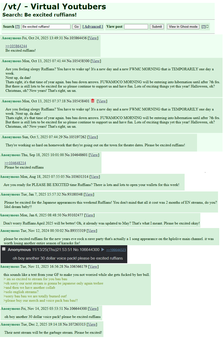 >>107278077>it's not like I changed my watching habits halfway through the yearBut FUWAMOCO did change their streaming habits. ASMR doesn't register, nor members which is about all they did besides a few retro gaming streams and silent hill.