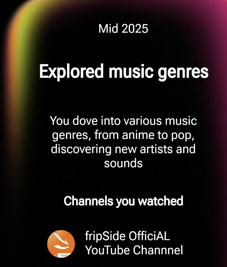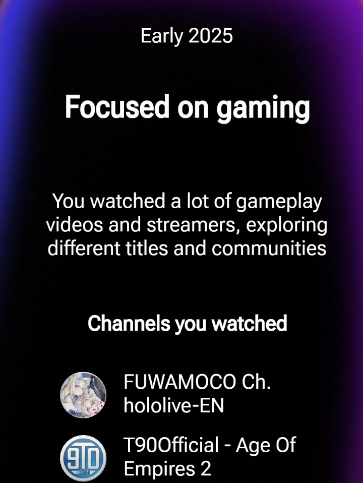 >>107278032I should say my top in "focused on gaming" not overall. By the way, mine was early 2025 as well. What were your mid and late 2025s? Mine were cooking and tech news. I wonder if YT is just being lazy and making arbitrary time periods and categories. Because it's not like I changed my watching habits halfway through the year.