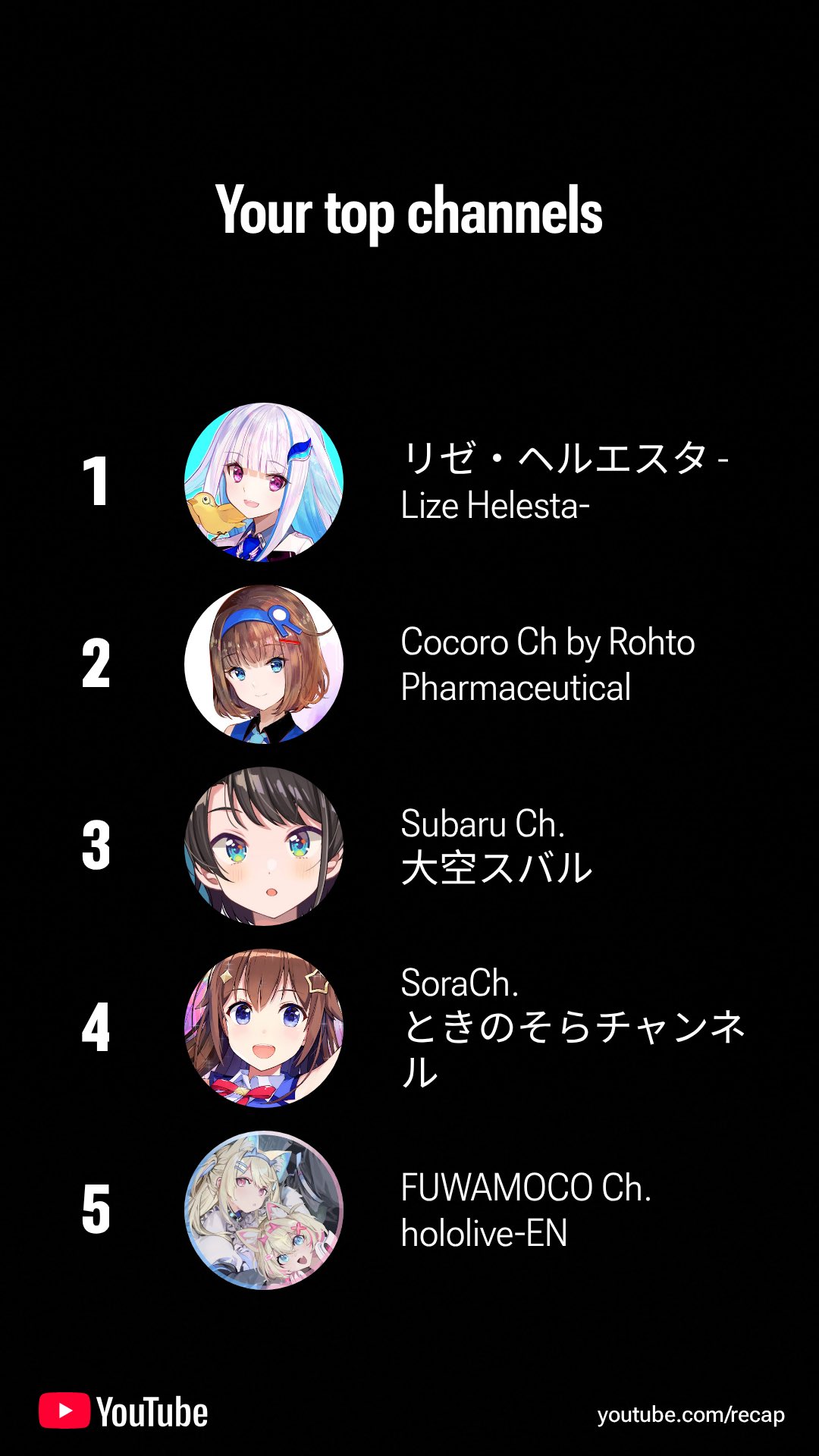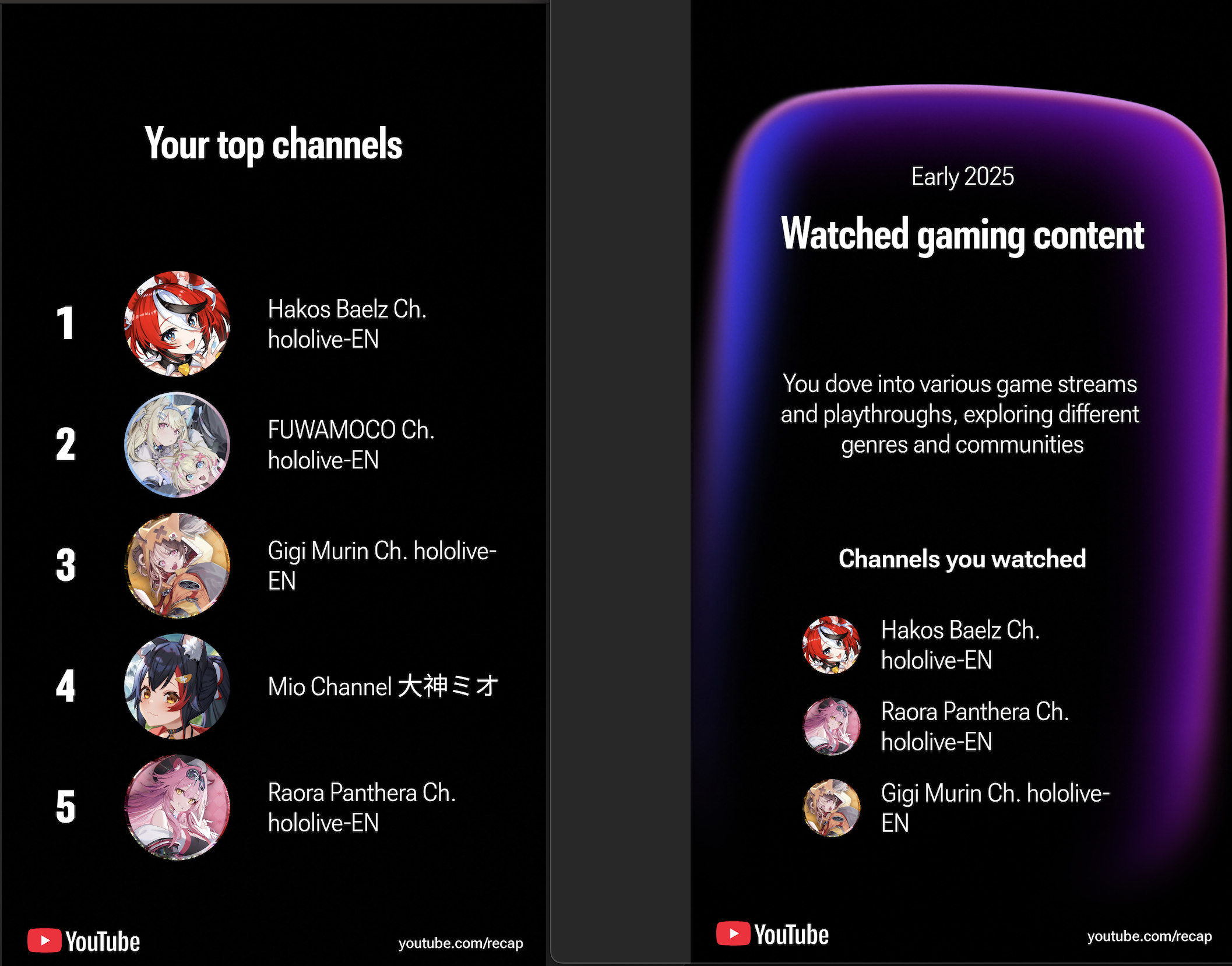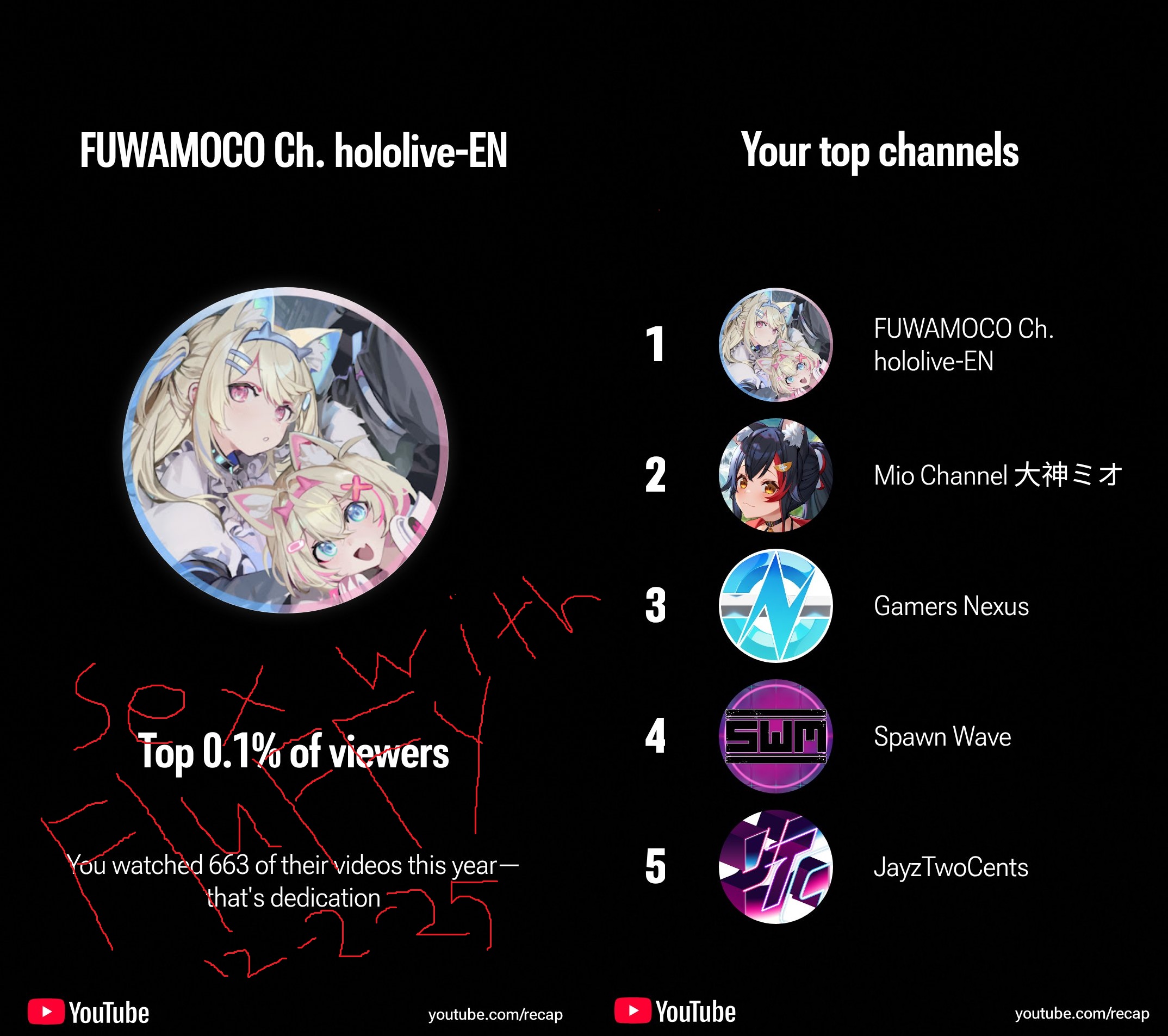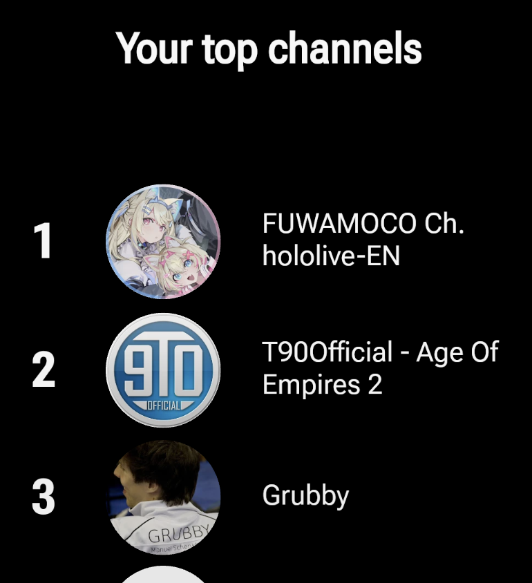 FUWAMOCO don't even register as a gaming channel on my recap, even though they are the channel I watched the most. They've completely failed in the algorithm according to the year end categories.