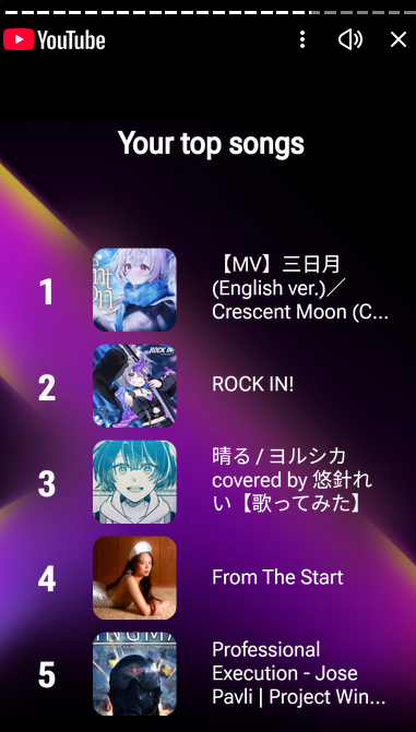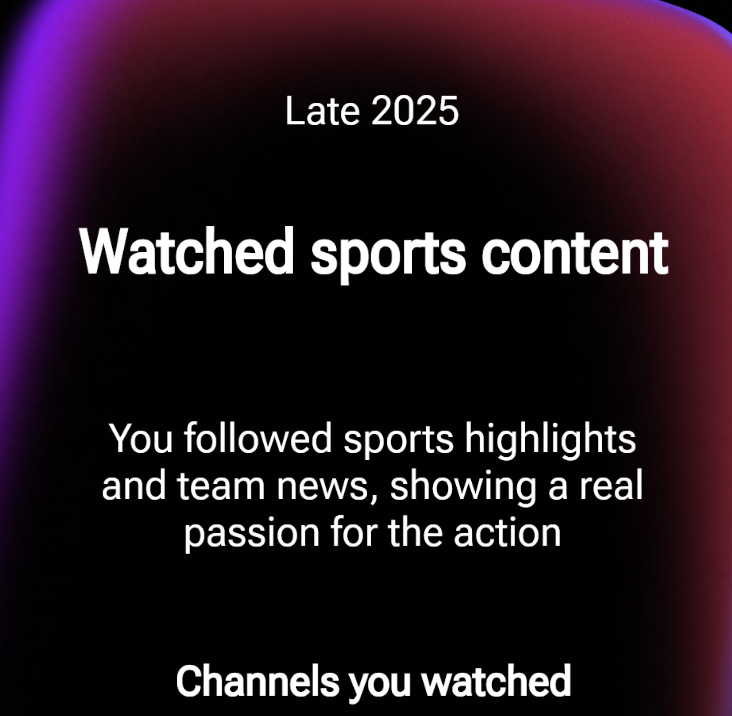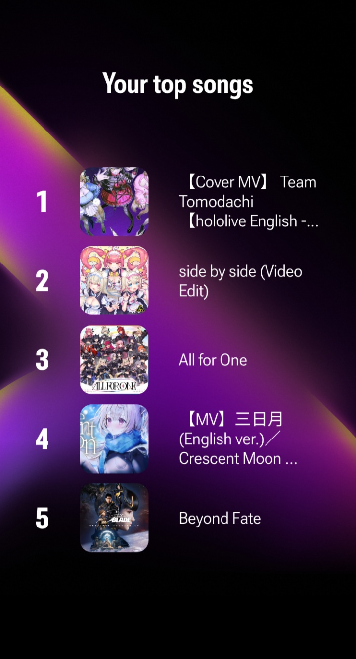>>107278539Did you get repeat categories? Mine was gaming, music and sports. I know for a fact music and sports is a lie. I definitely didn't listen to fripside more than I watch FUWAMOCO