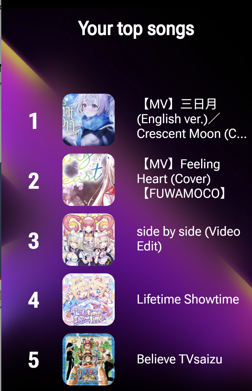 >>107277859It's weird that FUWAMOCO I watched 100x more than anyone else on my list but the only thing YT recognizes is that I watched them a lot, in the categories at the end, they are completely absent. IRyS doesn't even stream that much and I didn't watch Biboo a lot, and together I didn't watch them even a 5th as much as FUWAMOCO. Yet in the categories other than time watched, they're just absent.