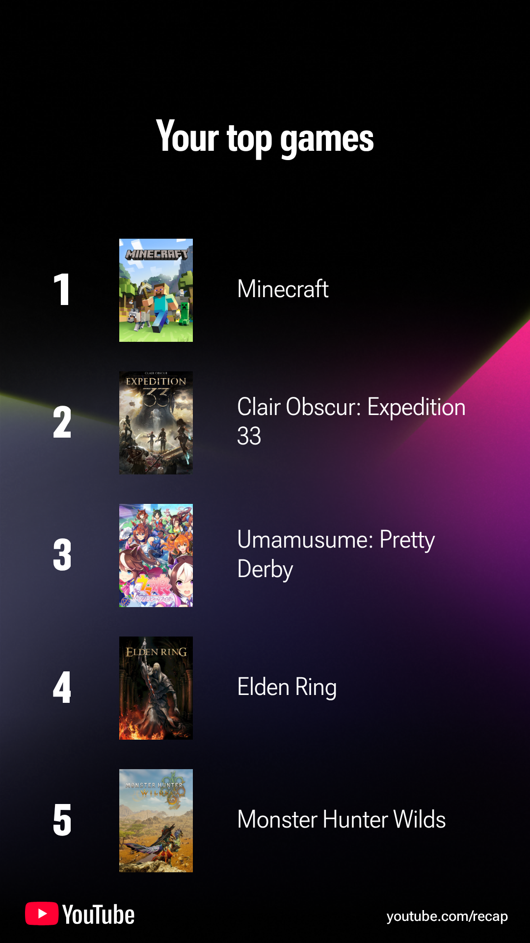 It says my top game is Monster Hunter Wilds which is ridiculous because I think I watched like one stream of IRyS or someone play it and I had it on the background.