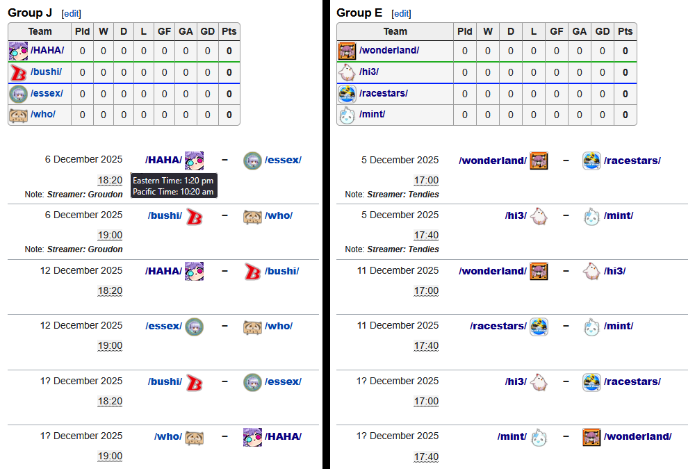 Quick divegrass reminder: the Christmas event is starting soon. We're in group J and our first match will be this Saturday. /mint/ will also be playing in group E the day before us. Unless something changes, the matches should be streamed at https://isthisliv.com/stream. Hope to see you there.