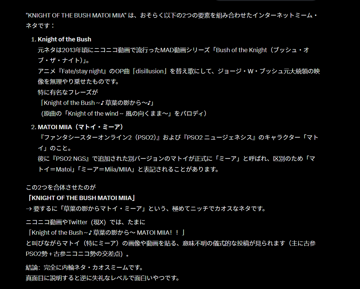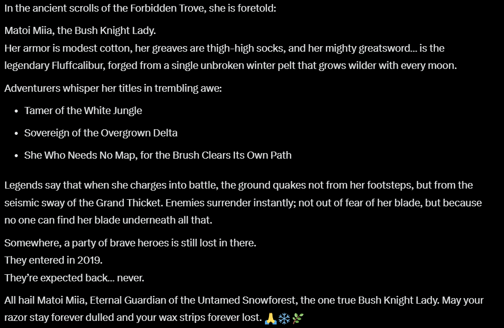>>107279619What do you mean? Matoi Miia, Bush Knight Lady of the Forbidden Trove, Sovereign of the White Jungle, Wielder of Fluffcalibur, She Who Blocks All Line-of-Sight Below the Belt.It's part of the lore.