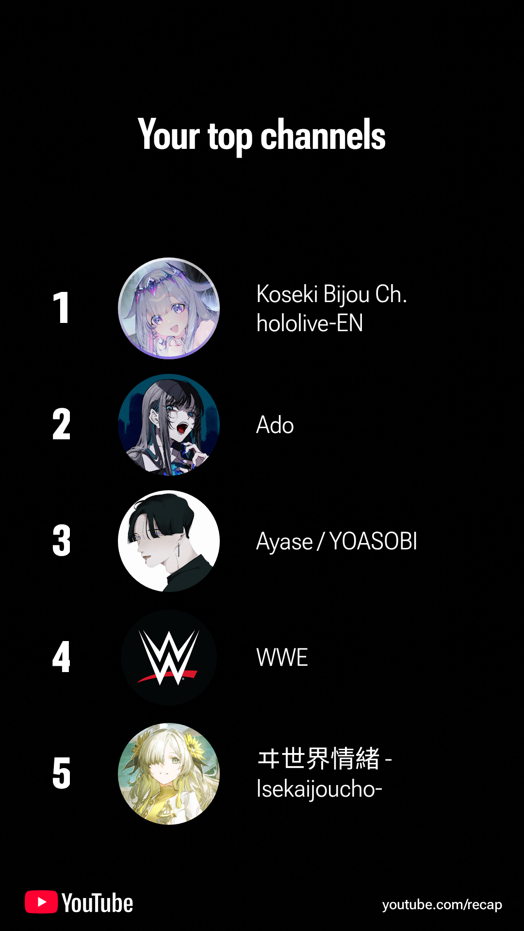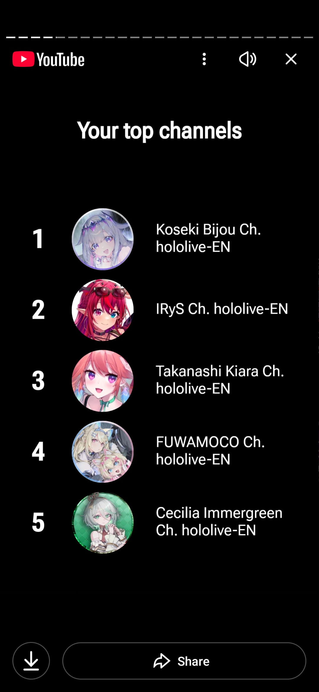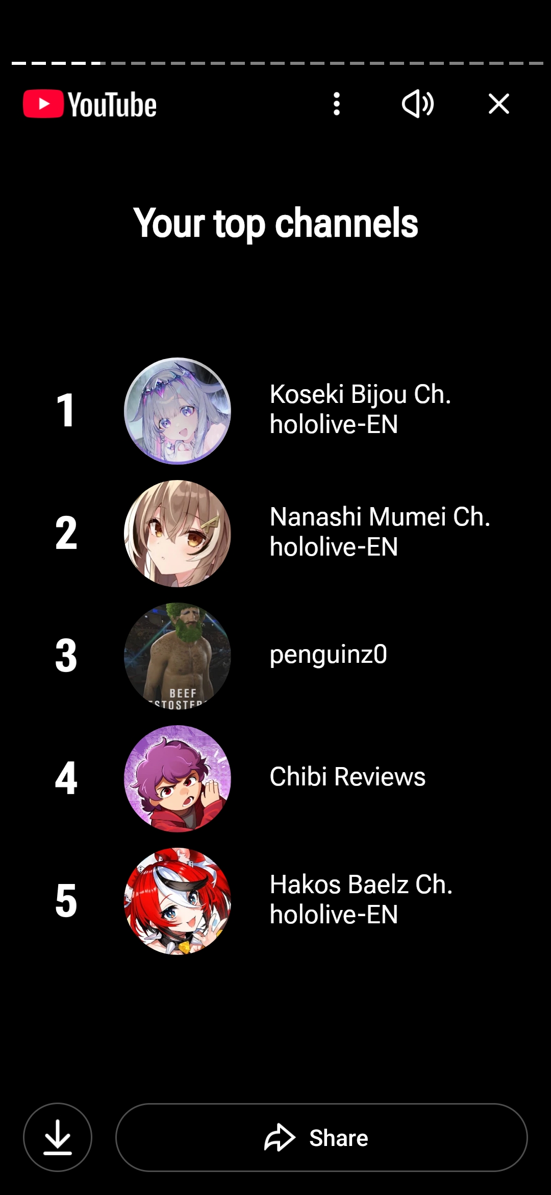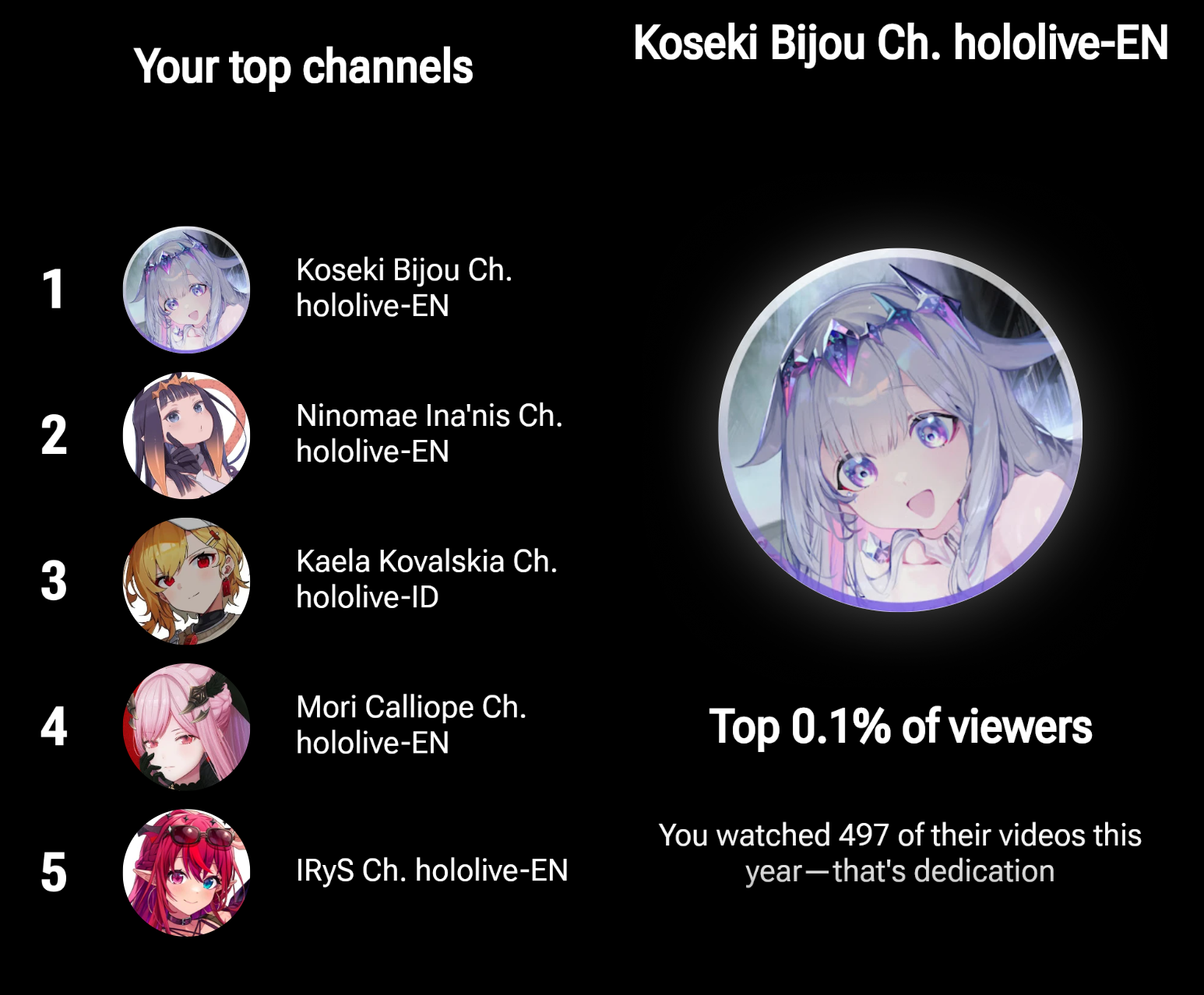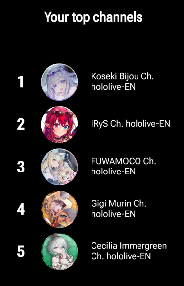 >>107285692biboo (who's #1) is the only vtuber on my top 5, the rest of them are Soulsborne speedrunners/challenge runners...