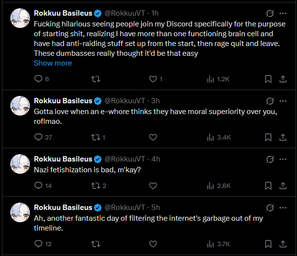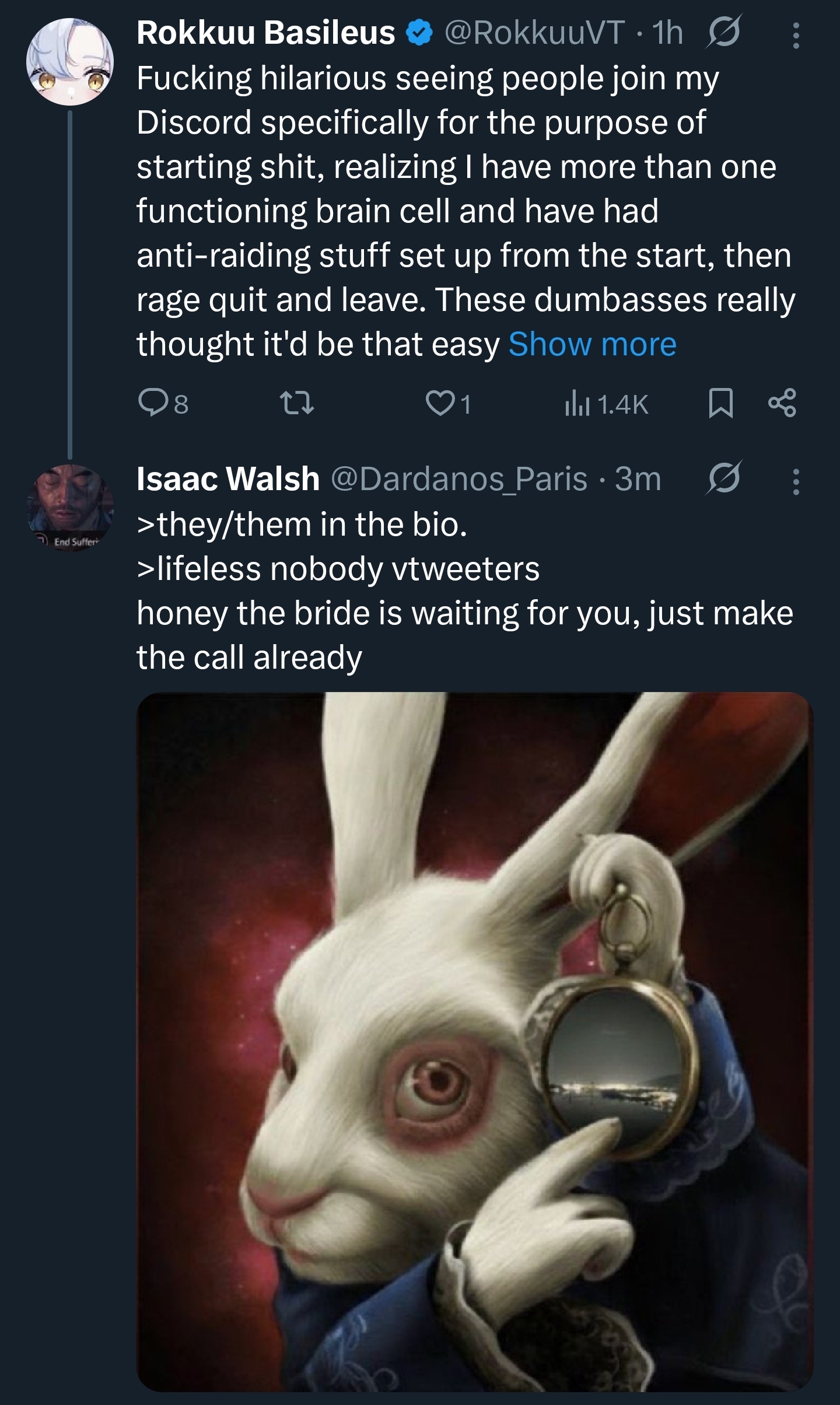 >>107335450this whole thing is a proxy war for the chud vtweeters vs woke vtweeters, I half believe theyve got discords planning and strategizing for this shit