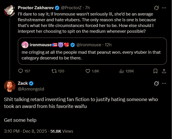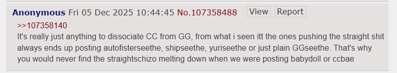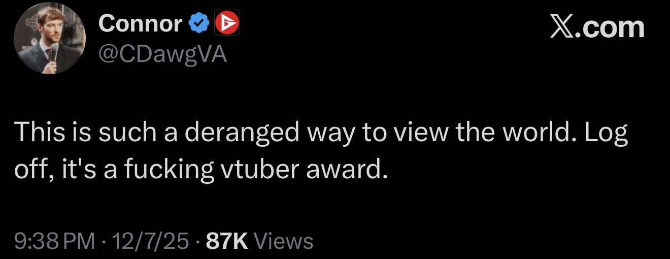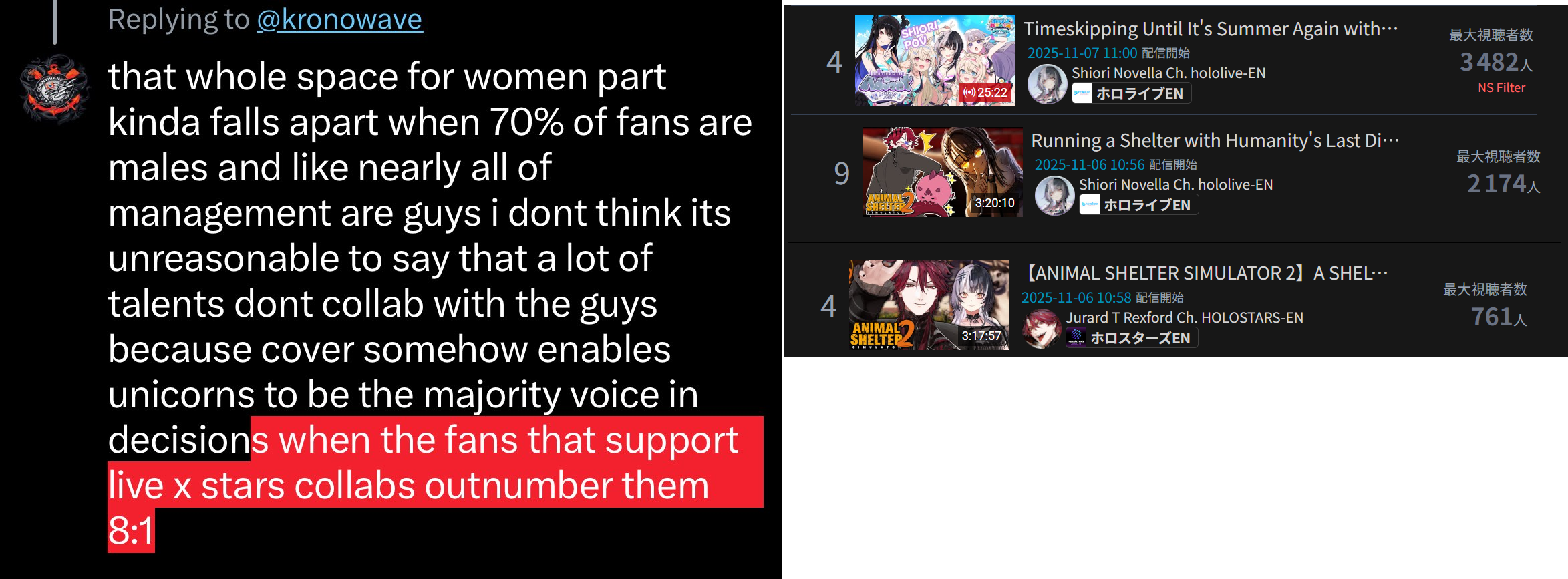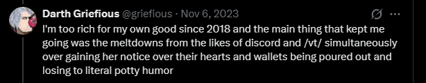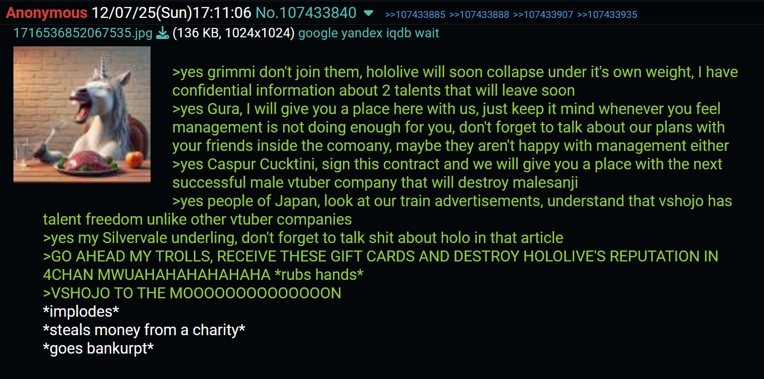 >>107453365As I said in another thread, VShojo was a great outside filter, because anyone retarded enough to buy into VShojo whispering in their ears without verifying shit for themselves would've probably defaulted to clique behaviour.