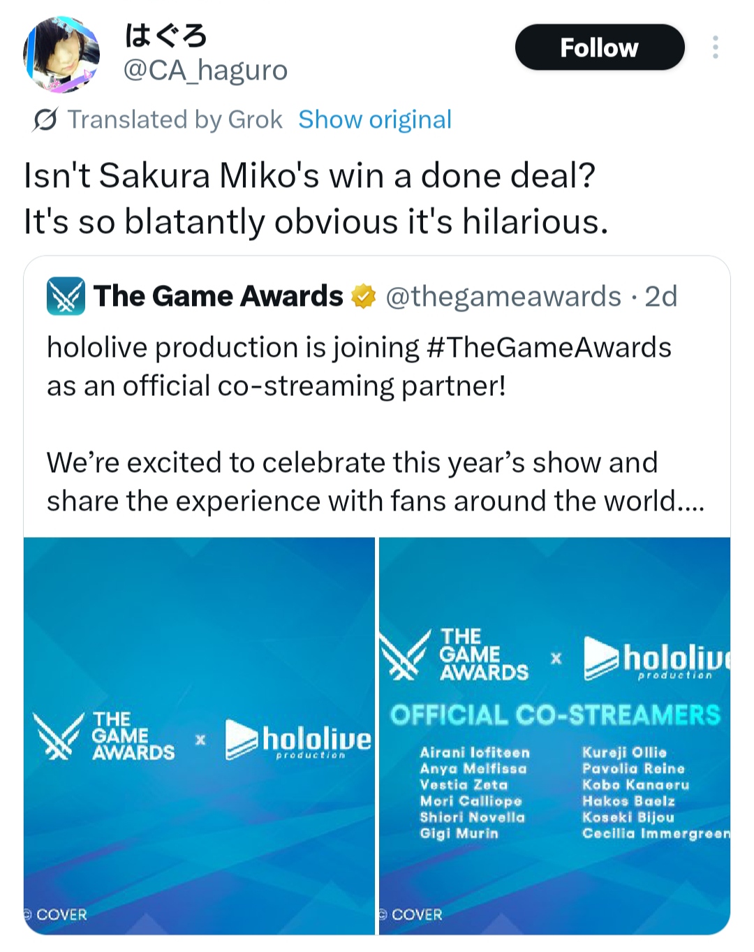 if miko wins game award then it's rigged. nobody outside japan watches her.