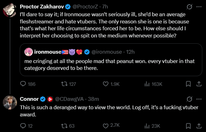 >>107453727I think people who stream on Twitch are more likely to be completely ignorant of the vtuber audience. It's by definition; they stream on Twitch to the Twitch audience not on Youtube to the vtuber audience.