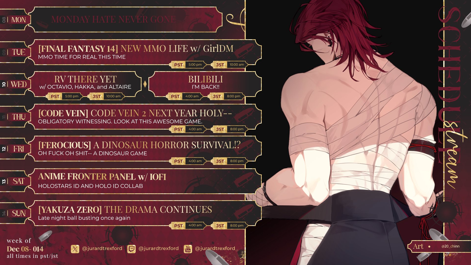 >>107453125Her graduation wan't synced up with the rest of Justice>Grimmi announces her graduation on February 4th saying the graduation will be on March 3rd. >February 12th Grimmi ungradautes and says the 3rd will be a redebut instead >Immerblue announces her graduation on February 24th with a date of March 10th >Hamster announces her vtubing hiatus on March 1st, the Horse also announces her graduation on March 1st again with a date of March 10th for the graduation >Yuniho announces her graduation on February 12th and graduates on March 10th >Elie Monty is harder to place but by March 14th she had scrubbed everything from the internetAlso>Selen is terminated on Feburary 5th 2024>The black screen stream comes out on February 12th 2025 at 8 PM EST, Grimmi ungraduates at 10pm