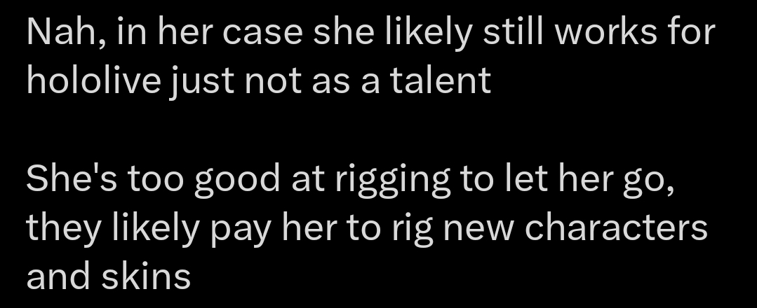 >>107453423The excuses people come up with to try and pretend she wasn't talking about Hololive are so fucking stupid lol