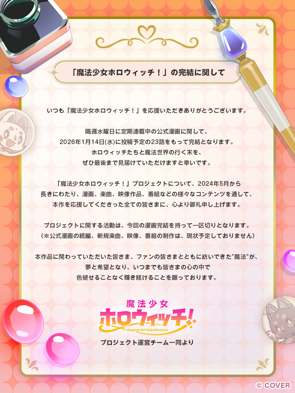 Holowitches informationIt's dead jimhttps://x.com/holoWitches/status/1998226102570164233https://www.youtube.com/watch?v=_qpO8vi9fpANew originalshttps://youtu.be/nrwvhoFDwzYhttps://youtu.be/FiljPRAhodwhttps://x.com/holoWitches/status/1909864205215543389Fubuki and Lamy have replaced Sakamata and Shion's slotsHomepage: https://holowitches.hololivepro.comTwitter: https://twitter.com/holoWitchesMain PV: https://youtu.be/lHY0bh2q9HEhttps://holowitches.hololivepro.com/comic_view/31/Goods: https://shop.hololivepro.com/products/magicalgirl_holowitcheshttps://shop.hololivepro.com/en/products/hololivefriendswithu_magicalgirl_lunahttps://www.youtube.com/watch?v=WV2_cgUA8cchttps://www.youtube.com/watch?v=2XmRgiWbUFs