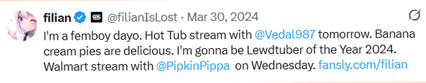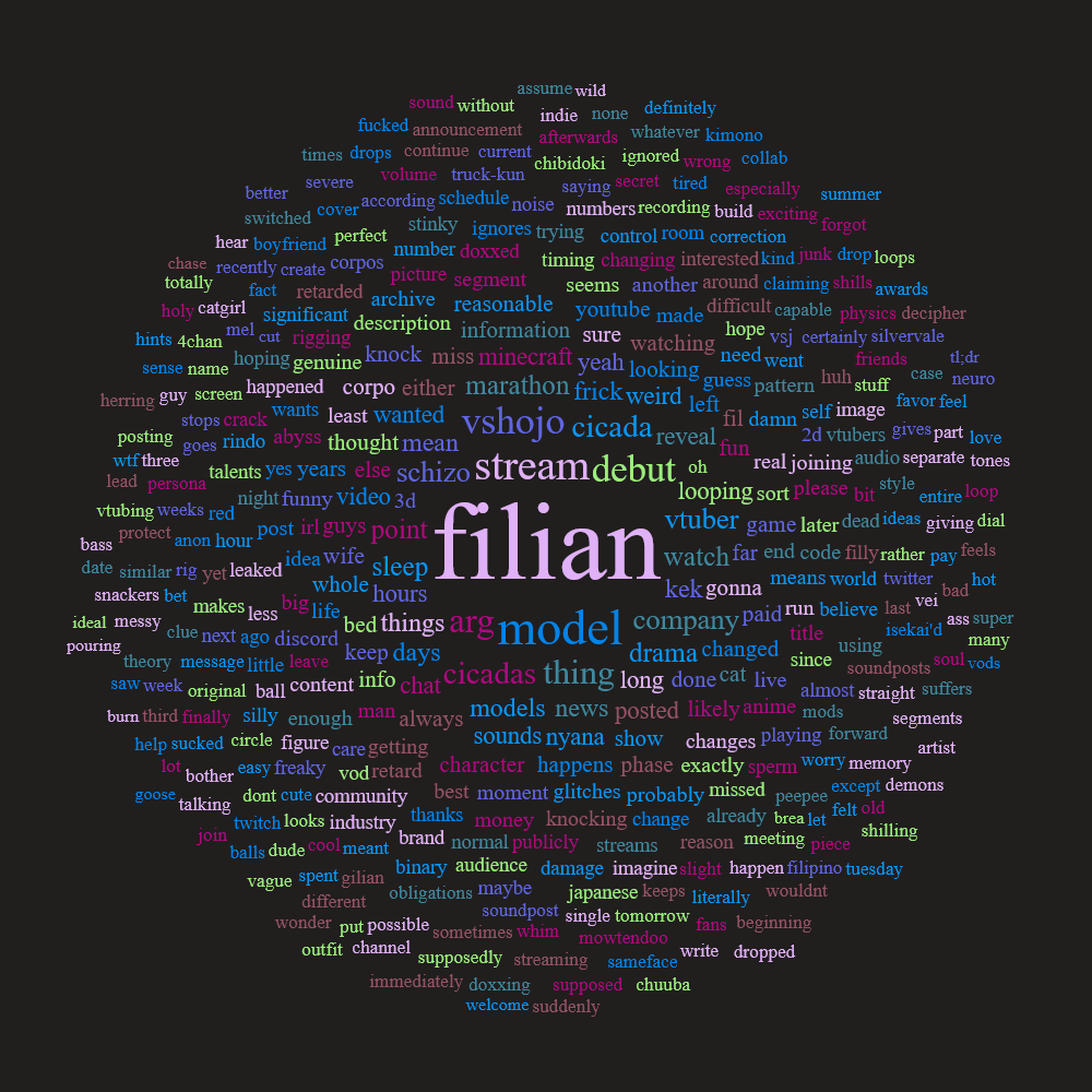 Maybe Filian overestimated our (4chan's) obsessive autism. We're not the ones going balls deep on her ARG arc. Her discord monkeys are. I've been saying it all along. She doesn't have anything to fear from us. We're just some cum jokers. The real people she needs to worry about are the ones desperately trying to get as close to her as possible. We're generally satisfied staying at the distance we currently are. An occasional mention keeps us happy even if it's an insult.
