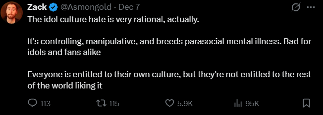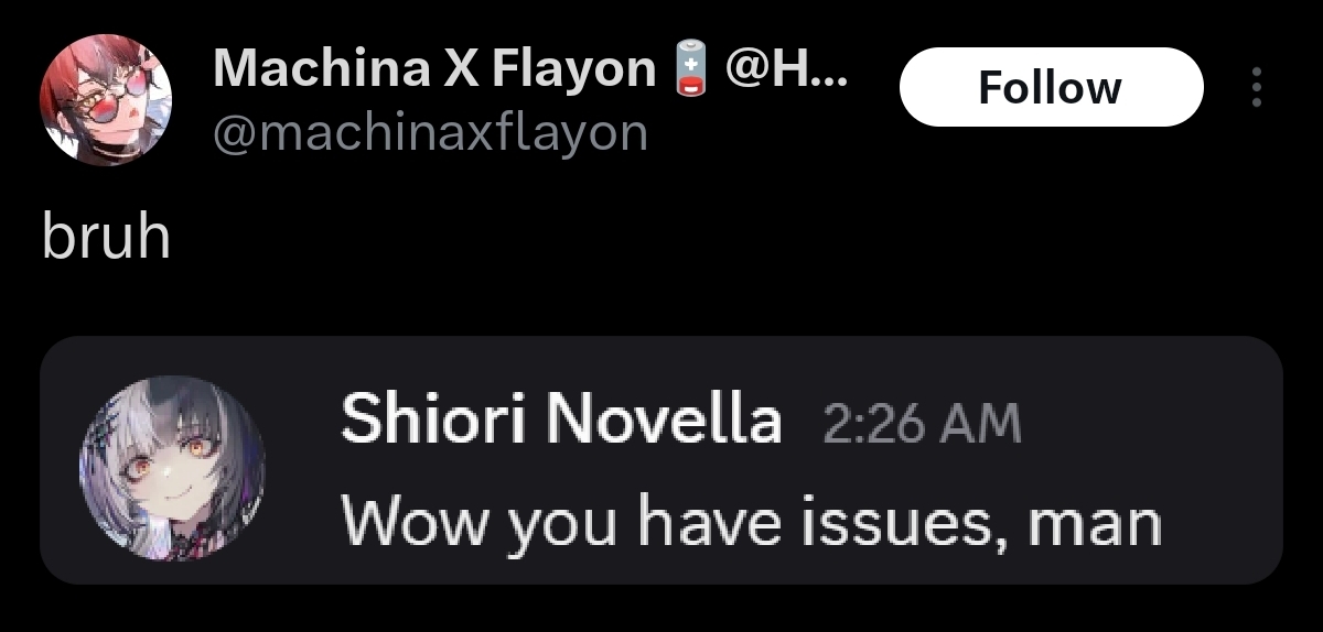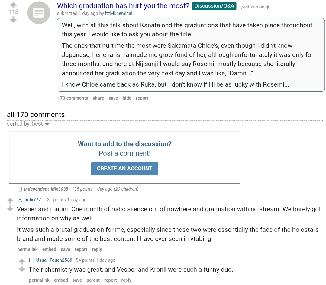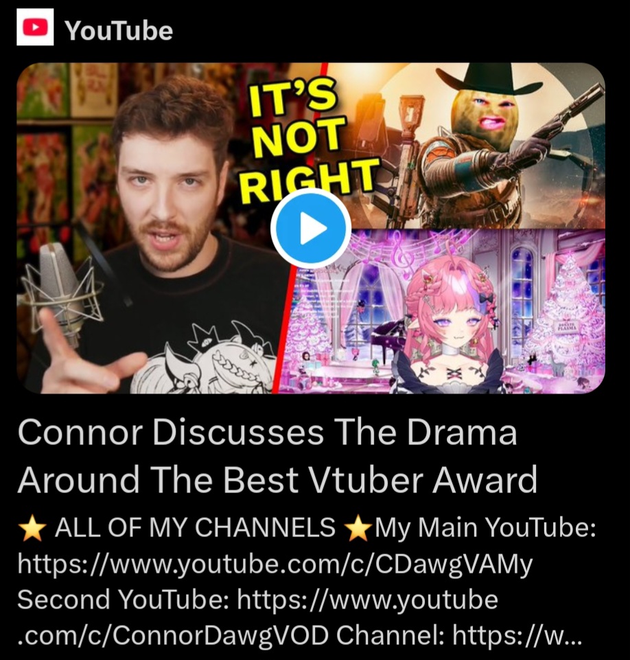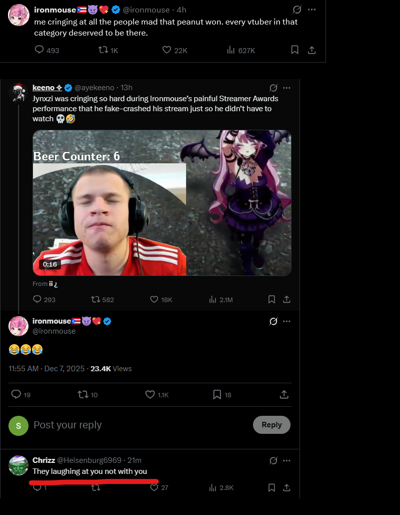>>107505587the tweet was bad enough, it's what triggered this whole controversy in the first place, nobody even listened to her stream rant by comparisonIt's kind of amazing how subtle the trigger was too, she just ever-so-slightly veered too far from "le graceful loser" LARP into literally punching down on vtubers to suck up to her flesh overlords and everyone, even her fans, immediately caught onto that bullshit and called her out.This is also why the containment breakers that went full mask-off about ironmouse actually blew up with thousands of likes, once the illusion of IM was shattered people realized they were 100% right about her only ever sucking up to fleshies and doing absolutely nothing for/with vtubers.