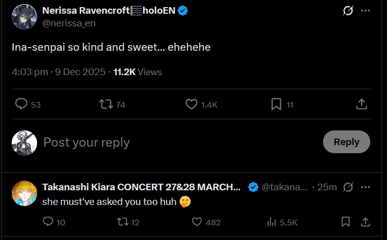 >>107501606>Tags Kiara in their post>She responds to the animationsI fail to see the issue. She's always been way more active on twitter than anyone else.