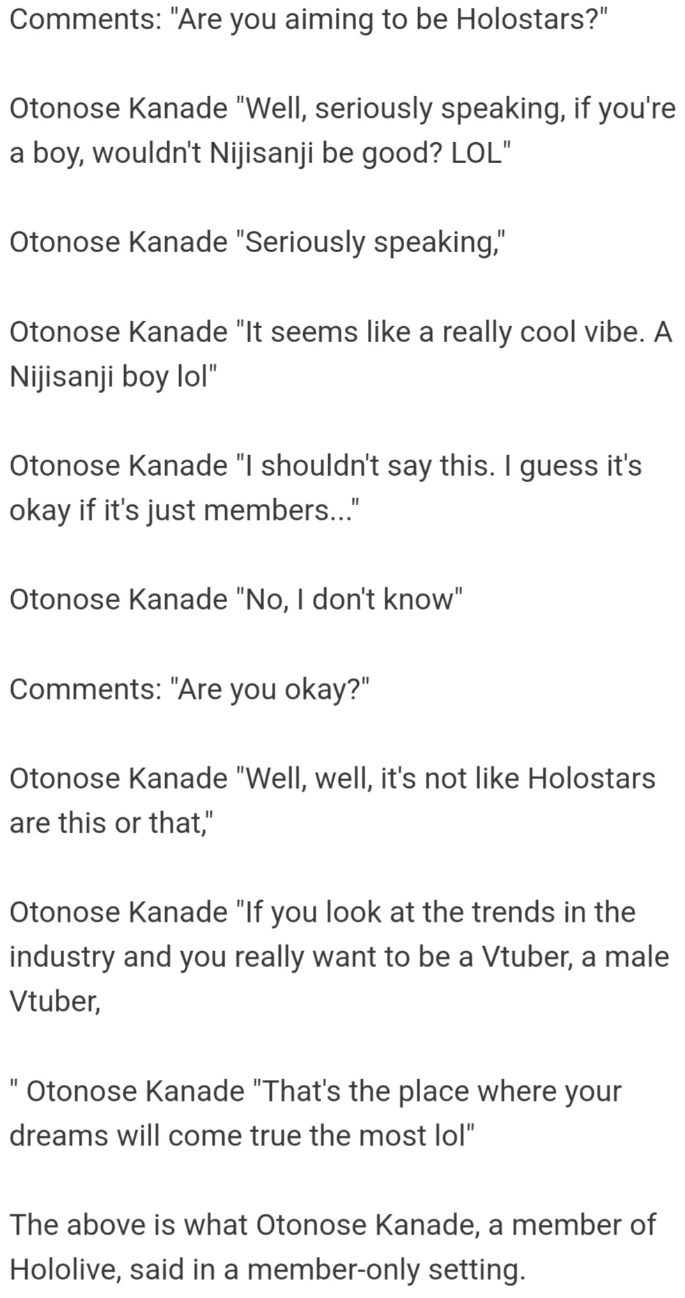 I didnt realize it first since theres not much new info that Kanata said in today's collab stream that she hasnt said in mengen with better nuance, but everyone is burning cover management right now because to most of them this is all new information.I pray for the clippers or people who usually provide EN TLs to be wise when translating.A bit of catch 22 as well since they can't directly provide better nuance since its member only info