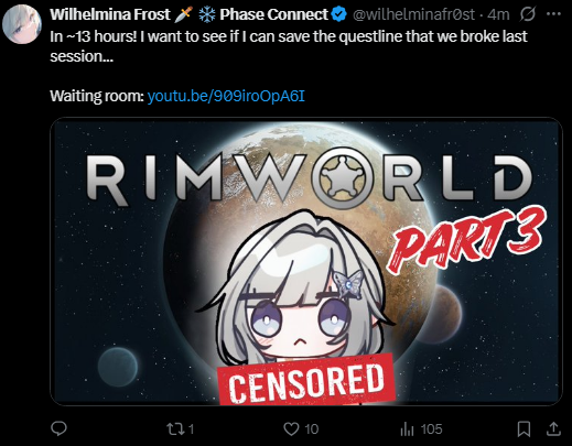 Big Willy returns to Rimworld!https://www.youtube.com/watch?v=909iroOpA6Ihttps://www.youtube.com/watch?v=909iroOpA6Ihttps://www.youtube.com/watch?v=909iroOpA6Ihttps://www.twitch.tv/wilhelminafrosthttps://www.twitch.tv/wilhelminafrosthttps://www.twitch.tv/wilhelminafrost