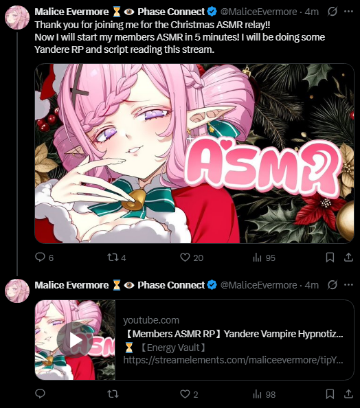 >>107659290I tuned in for a bit, kokoro was nice.But it's not over, Malistocrats now have "Members ASMR RP".>Yandere Vampire Hypnotizes You
