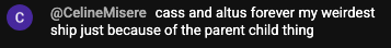 I like the dynamic of Zenrage but I can't seem to get into it. Oniwish and Onifang are still my favorites. And whatever Altus X Caelen is. Damn, Altus is quite shippable.....