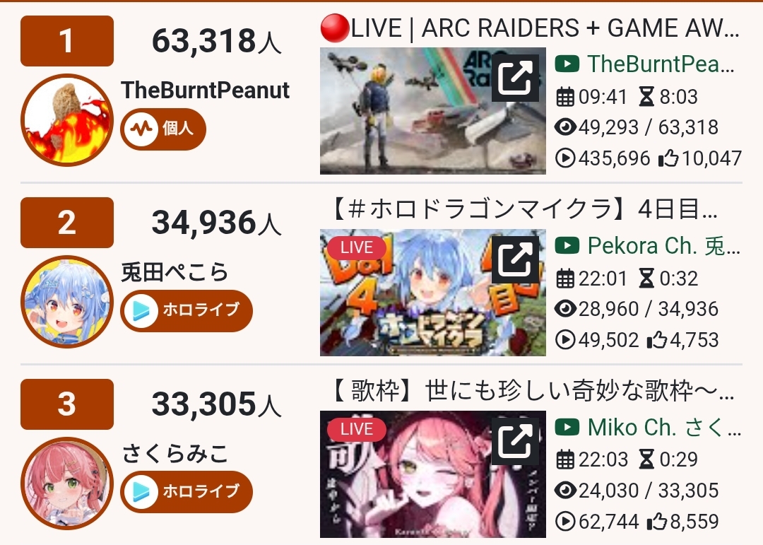 >>107601401>According to VSTATS' own calculations, the outcome of this year's rankings has already been decided. In first place is Sakura Miko (approximately 43.16 million hours), and in second place is Usada Pekora (approximately 41.24 million hours). While the rankings have changed compared to last year, Hololive's top two have once again established themselves as one-two finishers.>Everyone was convinced of this, but when we double-checked the detailed data on Streams Charts just to be sure, we discovered a shocking fact that completely overturned our understanding .>When we integrated the fragmented data from each platform and read between the lines, a completely different picture of the champion emerged.>Its name is The Burnt Peanut .Yes, he was so mad at the fact that Kuzunigger jobbed to PekoMiko that he added a fucking PNGtuber just to spite Holofans