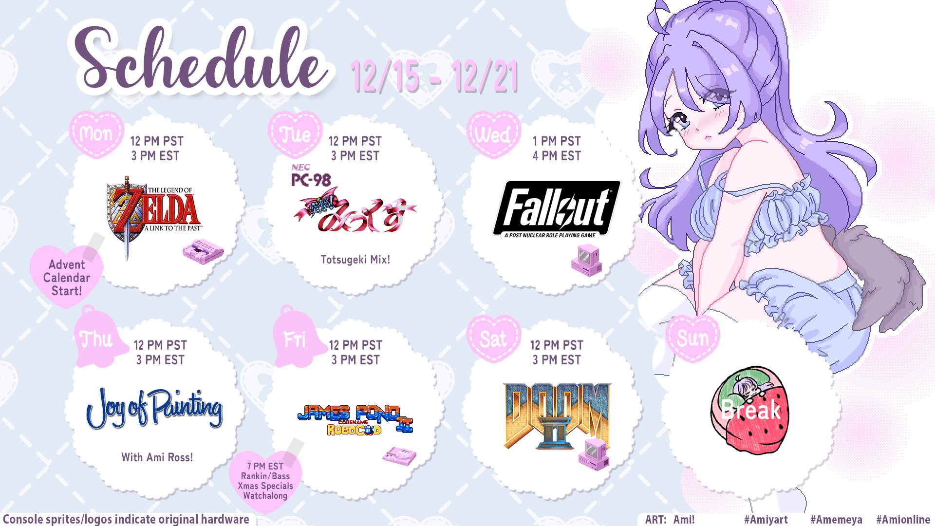 Amemochi Nina 19:00 "Mario Paint"https://www.youtube.com/watch?v=TaUzcgDt3N8https://www.youtube.com/watch?v=qRn1Z6KT91Y