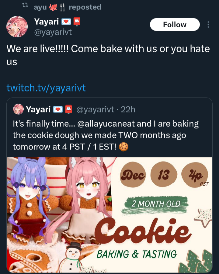 >>107678935>Pixel staff was literally posting linksIn late February and March, sure, but there was a six week period between late December and then when we didn't know what was happening. There was a very real chance Pixel would graduate them, vanish, and we'd have to find them on our own.I'm very grateful that PixelLink and Tora-P were as gracious as they were, but until the announcement all we had to go on were rumors and people dropping riddles about alt-accounts.
