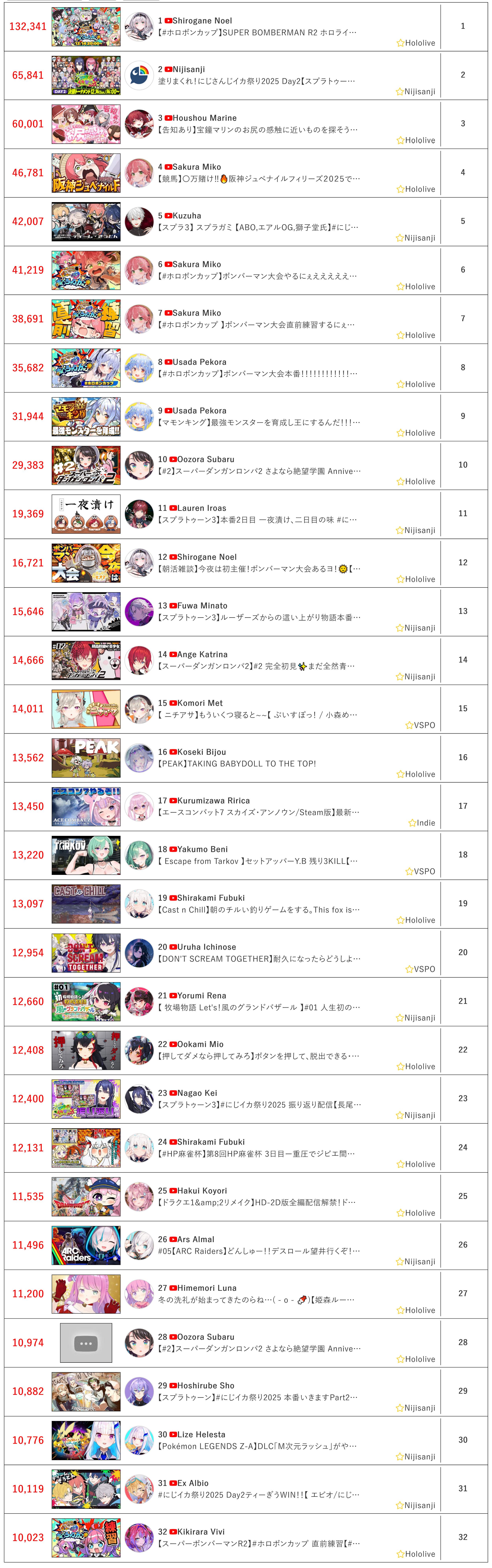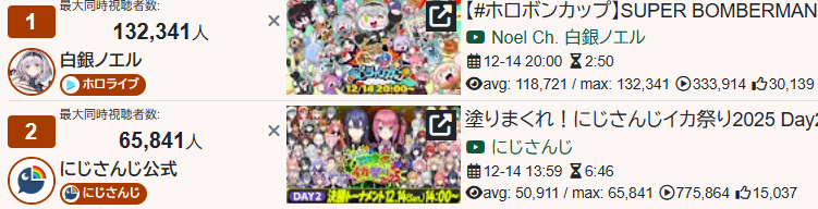 * FINAL TALLY OF THE DAY IS IN *Here it goes>132,341: Noel (Hololive)>65,841: Nijisanji (Nijisanji)>60,001: Marine (Hololive)>46,781: Miko (Hololive)>42,007: Kuzuha (Nijisanji)>41,219: Miko (Hololive)>38,691: Miko (Hololive)>35,682: Pekora (Hololive)>31,944: Pekora (Hololive)>29,383: Subaru (Hololive)>19,369: Iroas (Nijisanji)>16,721: Noel (Hololive)>15,646: Fuwa (Nijisanji)>14,666: Ange (Nijisanji)>14,011: Met (VSPO)>13,562: Bijou (Hololive)>13,450: Ririca (Indie)>13,220: Beni (VSPO)>13,097: Fubuki (Hololive)>12,954: Nose (VSPO)>12,660: Rena (Nijisanji)>12,408: Mio (Hololive)>12,400: Kei (Nijisanji)>12,131: Fubuki (Hololive)>11,535: Koyori (Hololive)>11,496: Ars (Nijisanji)>11,200: Luna (Hololive)>10,974: Subaru (Hololive)>10,882: Sho (Nijisanji)>10,776: Lize (Nijisanji)>10,119: Ex Albio (Nijisanji)>10,023: Vivi (Hololive)Gold for Noel with the bomber man tournament with Niji getting silver with their splatoon tournament
