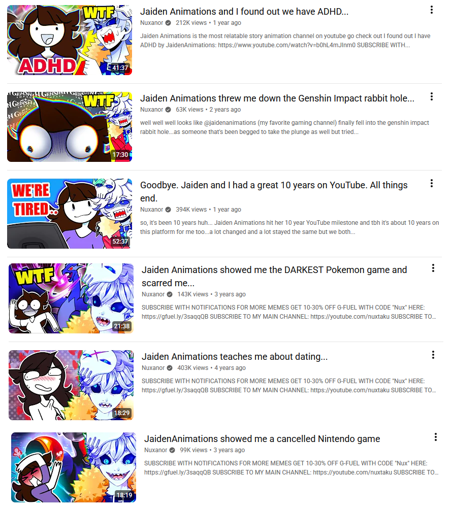 >>107769501He's a creep. Nux Taku (or "Nuxanor", the name of his much more active second channel) is a vtuber who posts mostly reaction content, but has a history interacting with anime and hentai. He first made a video reacting to Jaiden in December 2020, and has posted 14 more reactions in the time since. He has (as far as I can tell) one additional video published in July 2021, not reacting to Jaiden herself, but to the segment of her fanbase that oversexualises her and produces porn featuring her avatar.Last month, Jaiden posted a video reflecting on the 10 years she has spent as a youtuber, and Nux reacted to it, adding his own insight as someone who would celebrate his 10th year on the platform 10 days ago. He titled the video "Jaiden and I had a great 10 years on YouTube", which Jaiden's fanbase found to be creepy and parasocial, and decided that the 16 Jaiden videos on his channel constituted harassment, for which his account was allegedly reported. They also created a narrative that Jaiden was creeped out by the video and even commented on it, which is not true, and she has not reacted to the coverage in any way.Nux has reacted to the drama briefly, calling the flood of negative commenters "literal toddlers" based on a quote from Teen Titans Go! being used in the comments intended to disparage him. He stands by the video and its title, and even finds the drama funny, leaning into it on several occasions since.Jaiden and Nux do not know each other personally, and I am not aware of them ever having either interacted in real life or collaborated over the internet. -pleddit