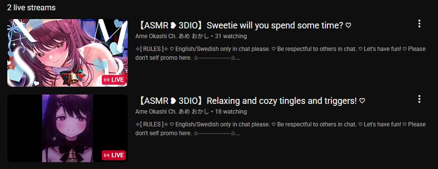 This thread is for the discussion and discovery of English-speaking VTubers who do ASMR.>Ongoing streamsvt.rita.moe/?tag=genre:ASMR&tag=lang:Englishvt.rita.moe/?tag=thread:/tingles/asmrfarm.com/ (Mixed JP/EN)Rentry with useful information: rentry.org/tinglesveeteeVTuber ASMR playlists: www.youtube.com/@tinglesanonPrevious thread: >>107763307