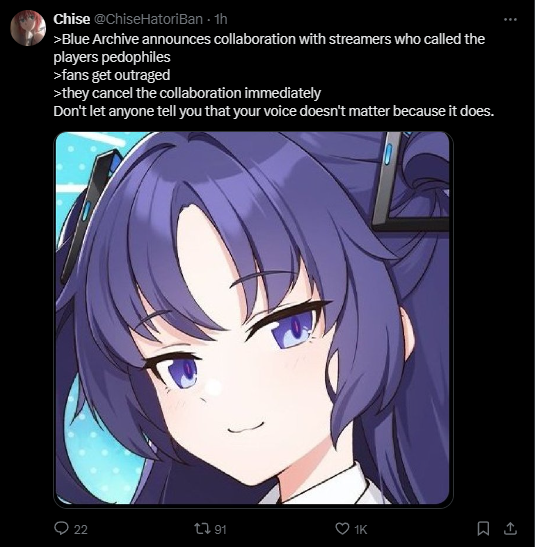 >>107775837Context since this thread is uselessNexon got into a lot of shit before when they tried to push influencers (specifically vtubers too) and they were told to stop wasting resources into something that nobody in the playerbase wants and to focus more into improving the game. They listened back then and they listened nowAs for this one in specific, same shit as before except one of the people (Cdawg) is a known loli anti and I'm sure you know how many lolis blue archive has. People were sharing him shitting on a blue archive figure even and not a single person liked him trying to promote the game.