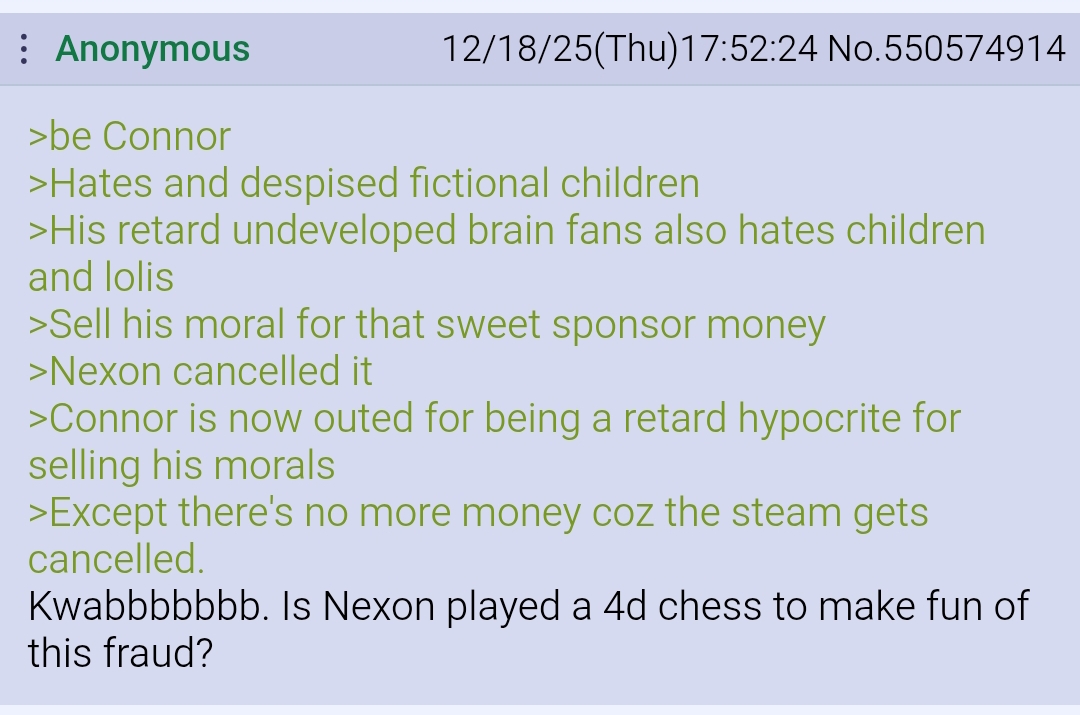 >>107778536>>107778542I call it you being late to the party lol. Connor is the one at fault and rightfully cancelled by their own game community. This entire thread is Phase living freely in /vt/s head if you ignore the truth of the situation. What now troll?