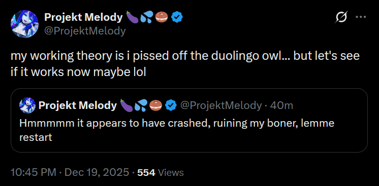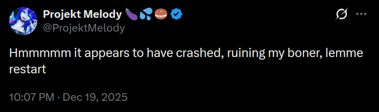 https://x.com/ProjektMelody/status/2002229266822676675It's always a bummer when Mel's stream crashes but it an extra bummer when it's during a lewd stream.