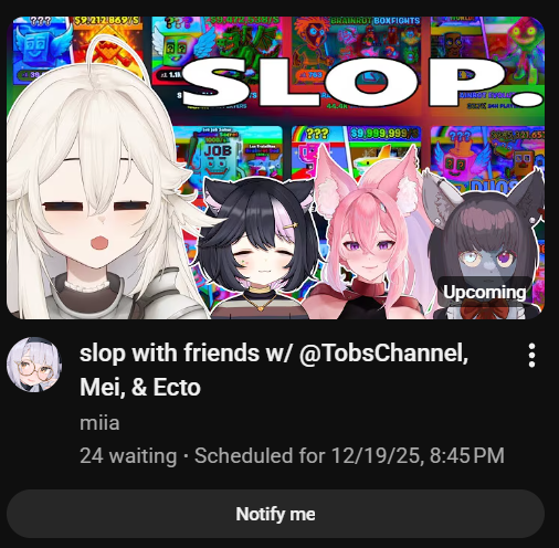 Liggerman post Edition>What is /lig/?/lig/ is a thread for viewers to find, share, and discuss indie vtubers who have on average 500 viewers or more.>Why /lig/?Large indie vtubers have more net fans, but they are outnumbered by 2views by the thousands. This is a thread for the VIP, regardless of what language they stream on.>Can I shill my 499view oshi here?Considering averages fluctuate widely, all the way down to 100 is reasonable. The minimal requirement however is being Twitch partner or the YouTube equivalent in numbers.>Wait isn't that one a corpo?/lig/ is a thread for chuubas of a decent size who aren't defined by their corporate branding, either due to the small size of the corporation or the independence and lack of oversight granted to the talents>/lig/ Numbershttps://lignumbers.neocities.org/>Twitch Clips Guidehttps://pastelink.net/34vd5>VOD Archival Guidehttps://rentry.org/Vod_Archival_Guide>/lig/ VOD Archivehttps://rentry.org/Indie_Vod_Archives_lig>Koikatsu cardshttps://mega.nz/folder/JYtkXJwL#07gAQCQqI_9FsmX9oQJKSA>/lig/ Wheel of Nameshttps://wheelofnames.com/49w-z2x>Tiermakerhttps://tiermaker.com/create/-lig--16586688-3>/lig/ Chuuba Birthday Calendar (WIP)https://www.canva.com/design/DAE-XgWodVg/ofLz4QC1yPPQ4T6TTAE0fw/edit?utm_content=DAE-XgWodVg>Upcoming BirthdaysDecember 19th - NeurosamaDecember 31st - Naiyo SpedeJanuary 2nd - MilkyJanuary 3rd - Olivia MonroeJanuary 10th - Essie_chJanuary 11th - Clauvio & IronmouseJanuary 14th - Shimada TigerJanuary 22nd - Lily HopkinsJanuary 24th - YuzuJanuary 25th - /lig/February 4th - Matara Kan>OC material for the OPhttps://mega.nz/folder/IIVD1IaJ#cfsRhWdJvzneIoG8HZUPuw>/lig/booruhttps://ligbooru.moe/>Duckshttps://www.twitch.tv/dashducks (embed) Other useful threads:>>>/vt//big/>>>/vt//corpo/>>>/vt//choc/>>>/vt//flip/>>>/vt//haha/>>>/vt//indie/>>>/vt//mint/>>>/vt//swarm/>>>/vt//vrt/>>>/vt//xvsj+/Previous Thread: >>107823076
