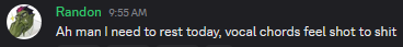 Randon — 9:55 AM>Ah man I need to rest today, vocal chords feel shot to shit