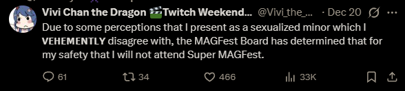 >>107864789I only saw False's tweet about it, but apparently she was a guest at MAGFest and then some extremists sent the convention threats of violence over her being there so they dropped her