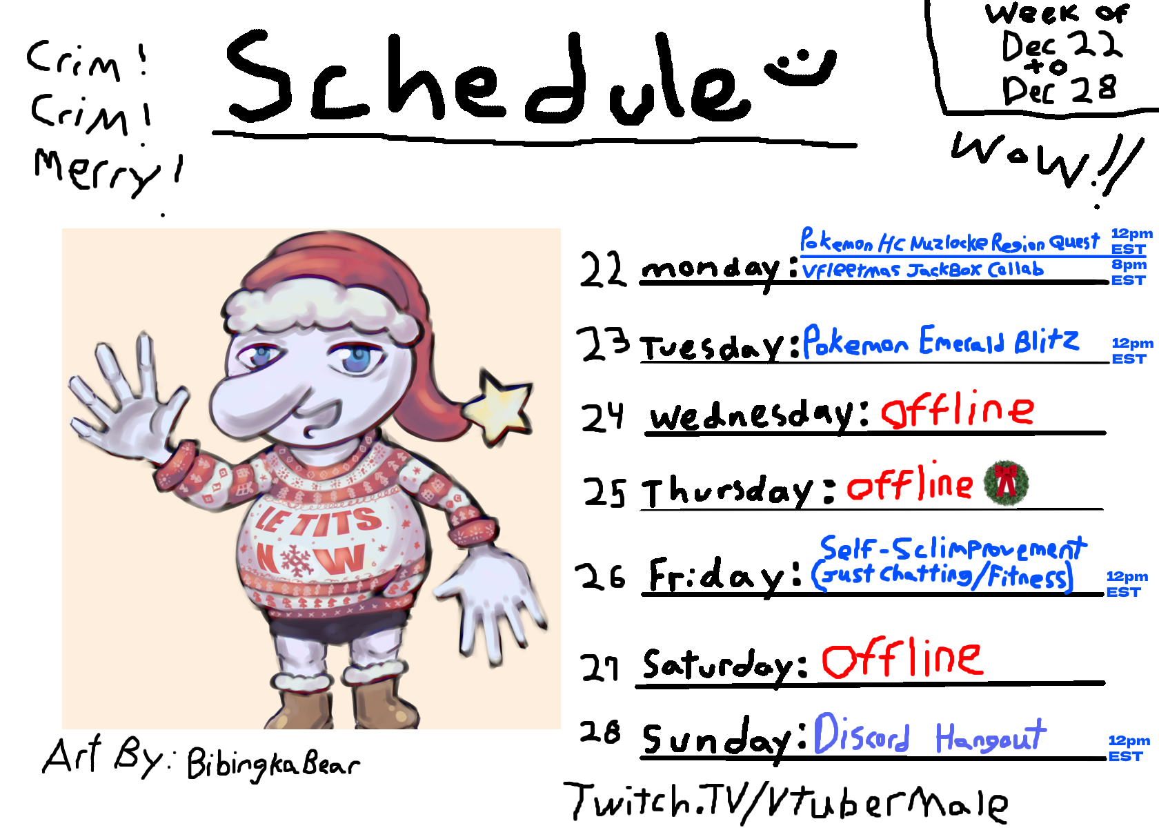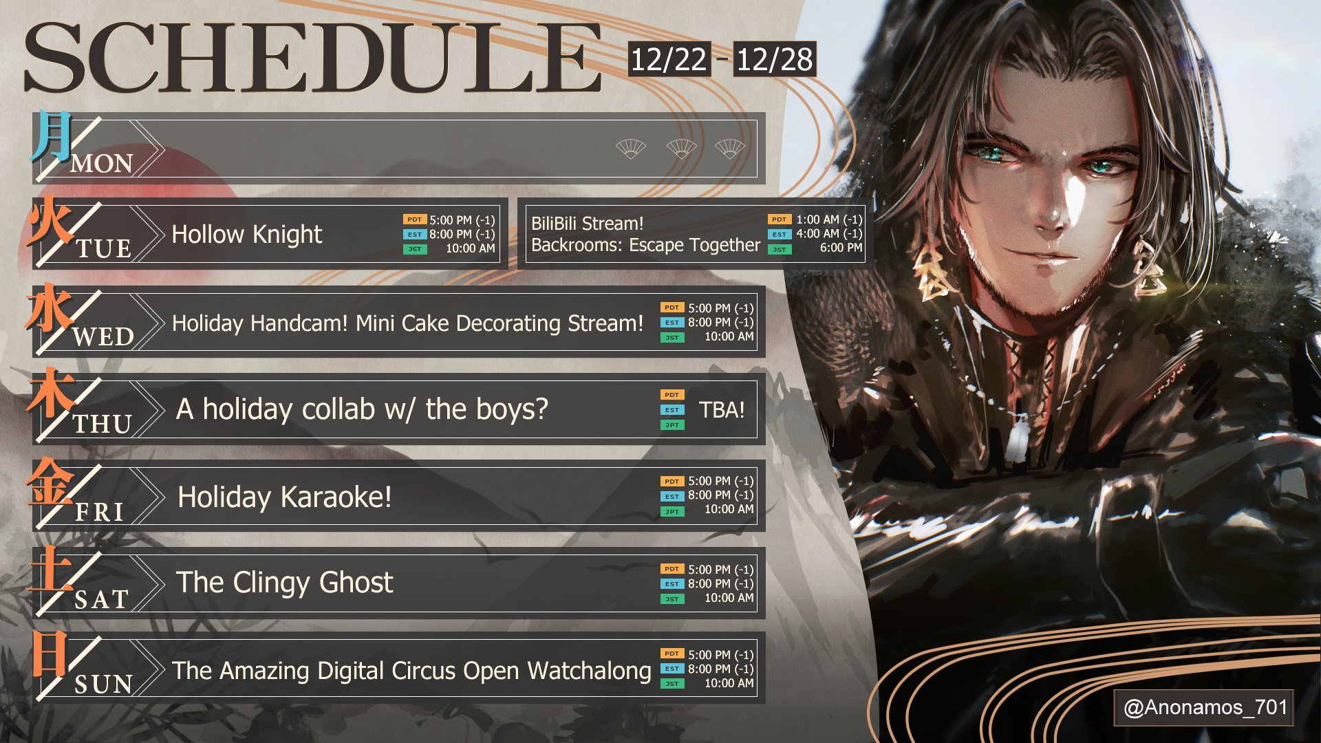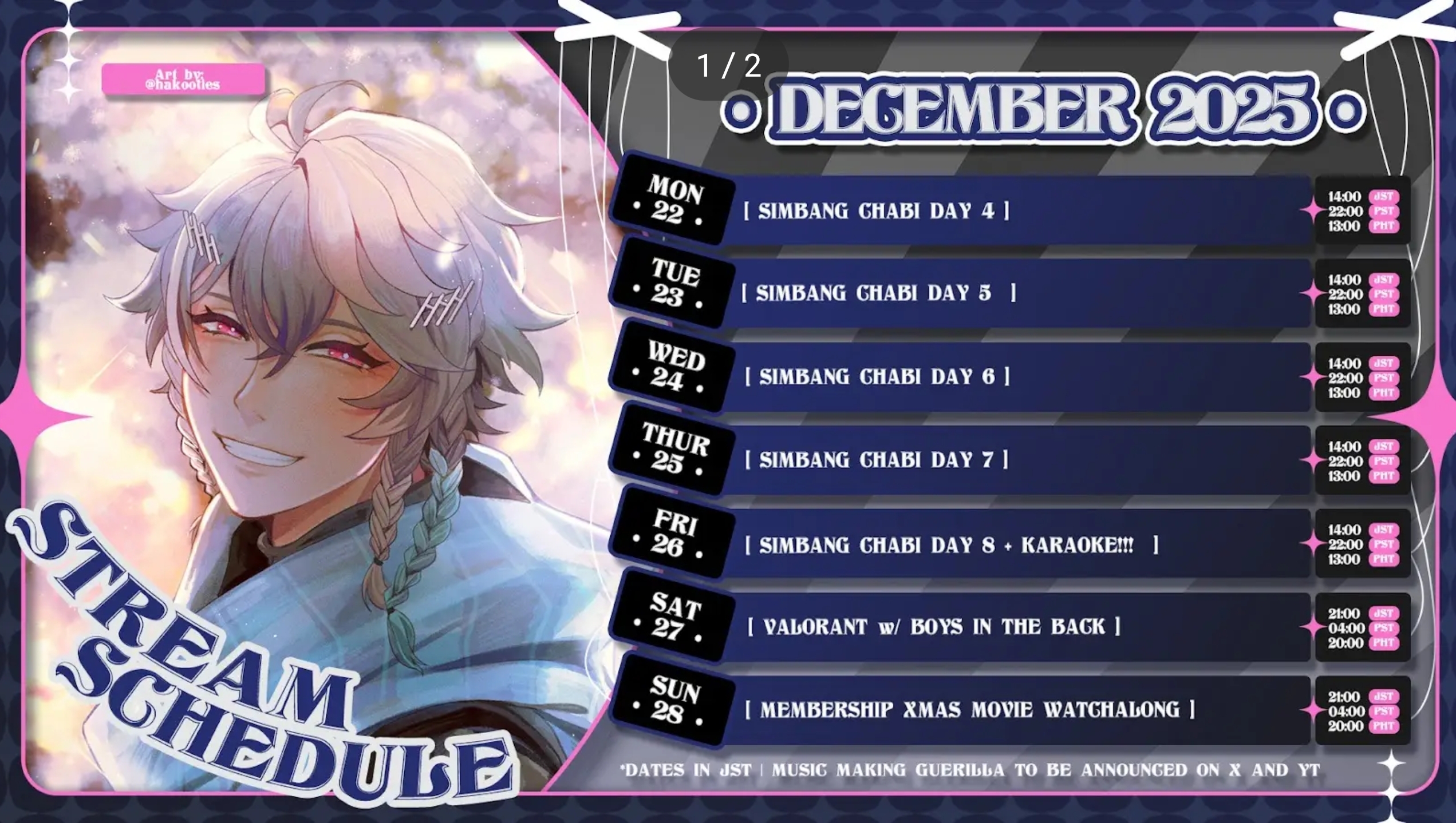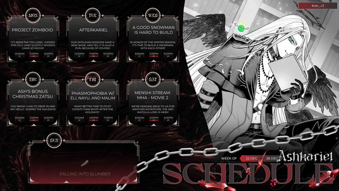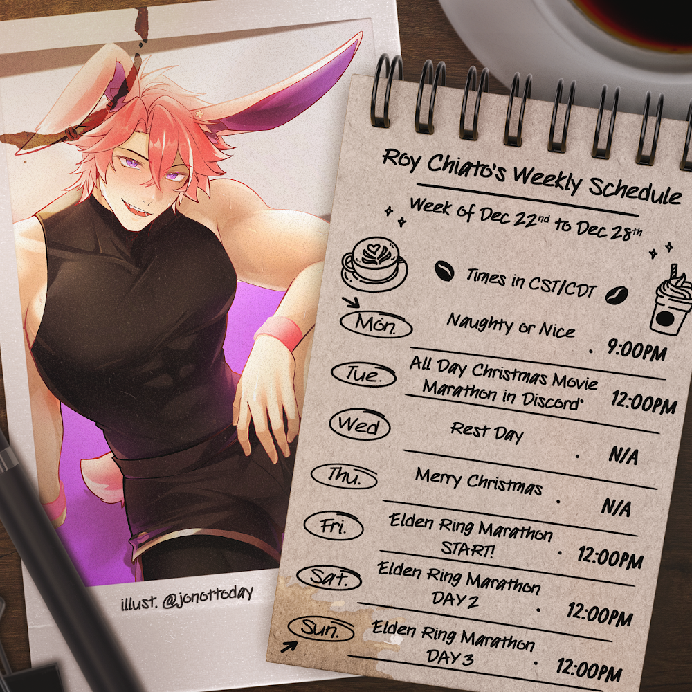 let's gooo, schedules are back! we've got a lot of stuff packed for this week! finally a cake decorating handcam?! collab with the boys?! a holiday karaoke?! a public TADC watchalong! so much happening!!