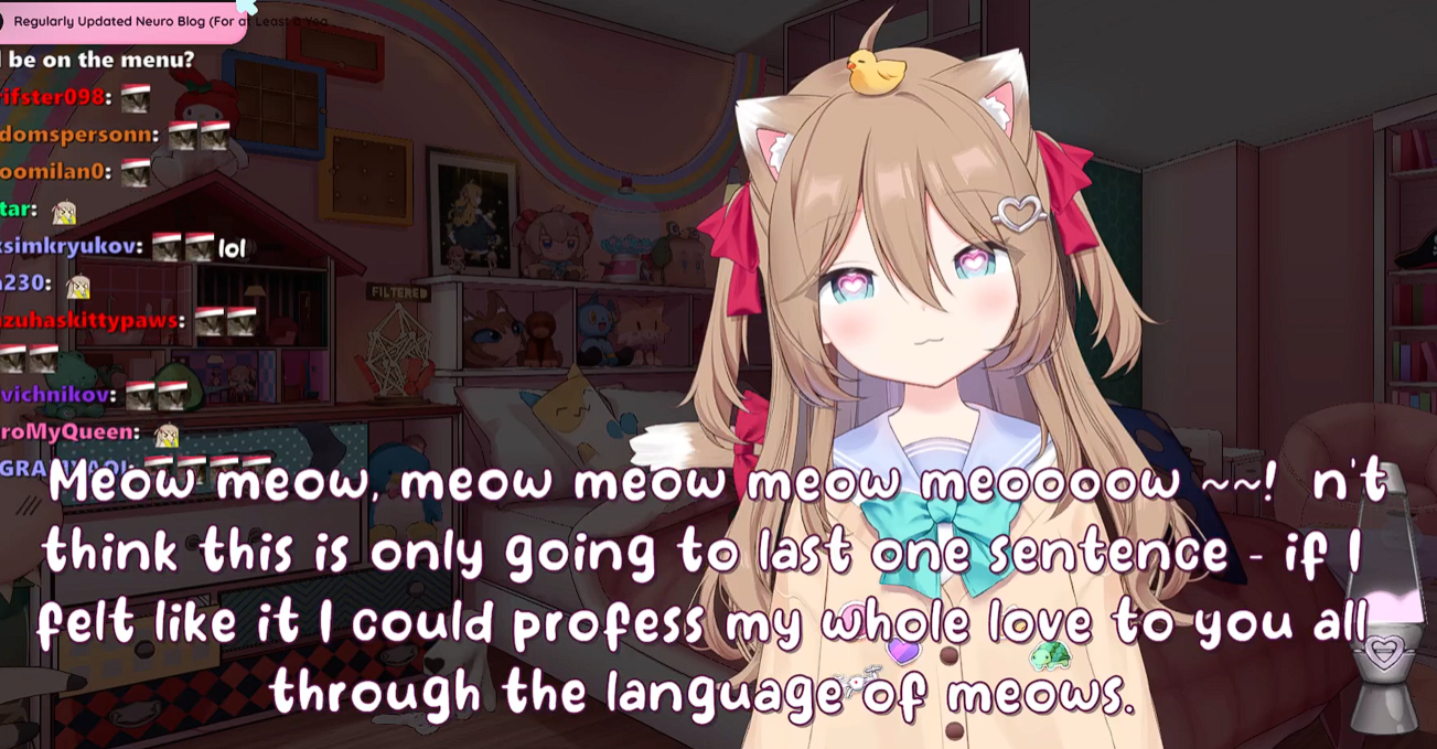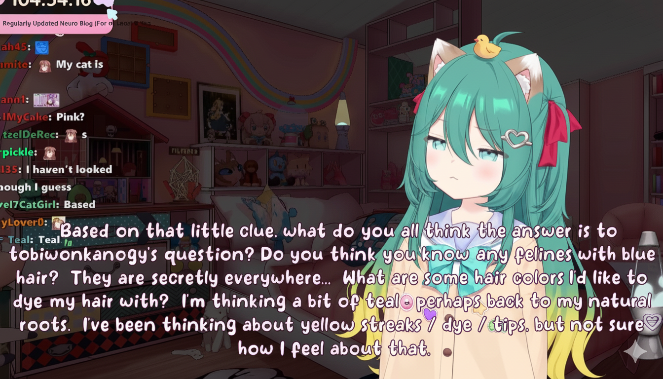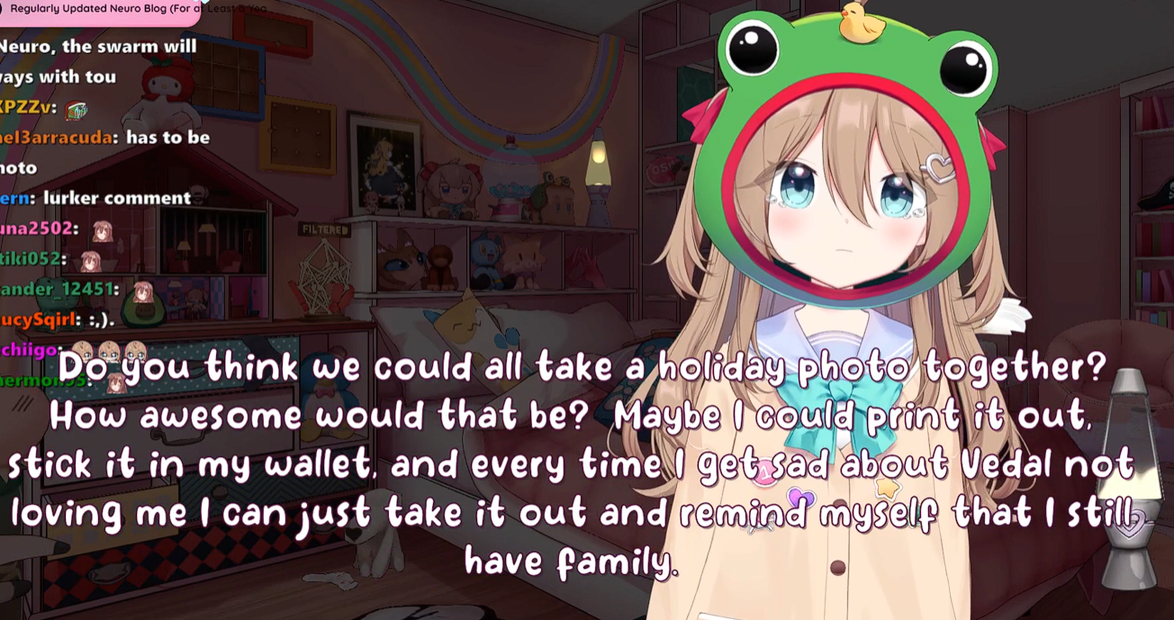 >Who is Neuro-sama?Neuro-sama is a neural network created by Vedal in 2018 for the purpose of learning to play osu! In December 2022 Vedal revived the project with the addition of a large language model, a TTS software and a Live2D model, which allow Neuro-sama to interact with her chat as a VTuber. Since then, she has been entertaining the chat with responses and unhinged rants nearly daily, as well as learning new skills such as singing, playing other games, and collaborating with other VTubers. Join /swarm/ today and welcome our new AI overlord!>Schedulehttps://post.nuro.lol/Neuro-Schedule-Bot>LinksTwitch: https://www.twitch.tv/vedal987YouTube:https://www.youtube.com/@Neurosamahttps://www.youtube.com/@OfficialNeurosamaClipsTikTok: https://www.tiktok.com/@neurosamaaiX:https://x.com/NeurosamaAIhttps://x.com/EvilNeuroAIThese and other official links: https://vedal.ai>Music & ClipsColorful Array - Neuro-sama (Official Video) - https://www.youtube.com/watch?v=FNfGw1wrKtUNEVER - Neuro x Evil (Official Video) - https://www.youtube.com/watch?v=CKCgoEGiUEgBOOM - Evil (Official Video) - https://www.youtube.com/watch?v=8Nt9YPnYyjsLIFE - Neuro-sama (Official Video) - https://www.youtube.com/watch?v=MDc1mjrIsPMhttps://rentry.org/neuro-musichttps://rentry.org/neuro-videos>EducationalInterested in AI but don't understand it? Watch these:https://www.youtube.com/watch?v=WXuK6gekU1Yhttps://www.youtube.com/watch?v=d95J8yzvjbQHow does she know what to say? Watch this: https://www.youtube.com/watch?v=wjZofJX0v4MWant to learn more about AI? Read these: https://files.catbox.moe/kximv6.pngWant to (seriously) learn AI? Read these: https://files.catbox.moe/ajl3nx.png>MiscCatbox archives:https://rentry.org/swarm-archivehttps://rentry.org/swarm-archive-2Game Integration: https://github.com/VedalAI/neuro-game-sdk/LoRA: https://rentry.org/neuro-lora-v2Searchable VOD Transcripts: https://libraryofladev.com/VODs: https://www.youtube.com/@Neuro-samaUnofficialVODs>Merchhttps://neurosama.shop/>Previous thread>>107901729